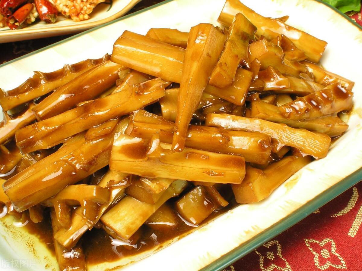- 鍋中倒入適量食用油,油熱後放入蔥段、薑片爆香。加入春筍塊翻炒均勻,加入生抽、老抽、白糖,繼續翻炒,使春筍均勻上色。