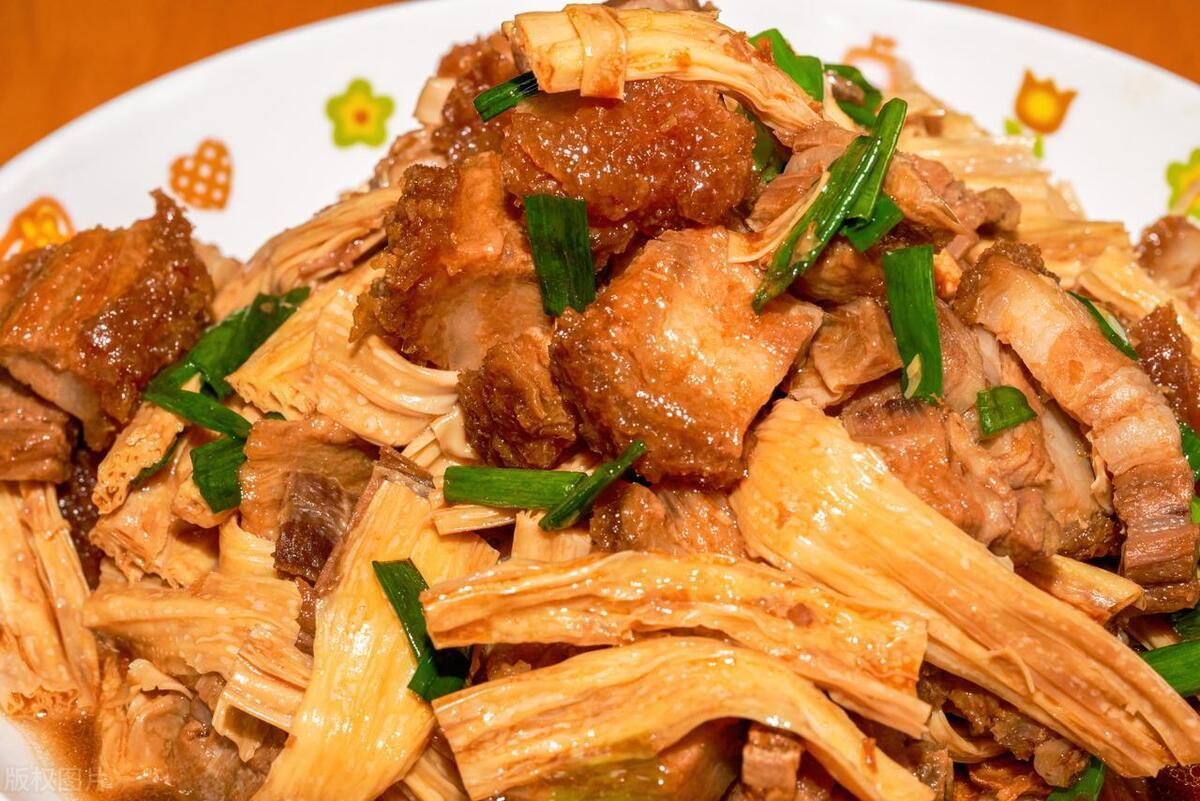 - 放入煸炒過的五花肉塊和腐竹段,轉小火燜煮 20 - 30 分鐘,至湯汁濃稠,根據個人口味加入適量鹽調味,大火收汁即可。
