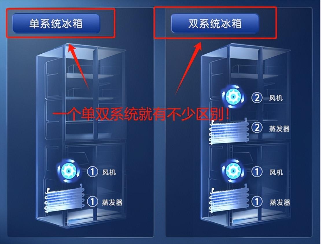 市面上的冰箱基本可以分爲單系統和雙系統兩種。前者內部只搭載了一臺蒸發器作爲產生冷氣的源頭,冰箱不論是上下的冷氣都從這裏來,說白了就像是一臺空調給兩個沒做隔斷的房間提供冷氣,這邊有味道那邊也沒辦法倖免;雙系統冰箱則不然,它搭載兩臺蒸發器,給房間徹底做了隔斷還各自裝上空調,防串味效果非常明顯。