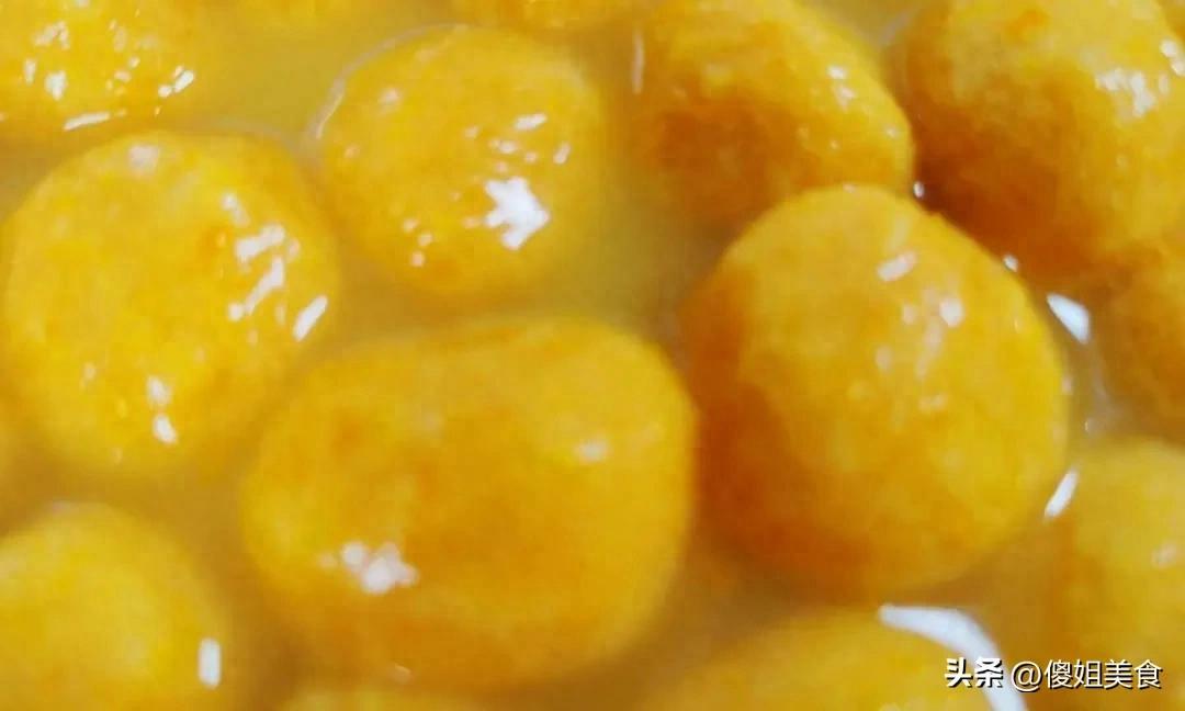4、冷水下丸子容易散!一定要等水冒小魚眼泡時轉中小火,輕輕放入丸子。用湯勺背推兩下防粘底,等丸子們咕嘟咕嘟浮起來,像溫泉蛋般晃悠就熟透啦!
