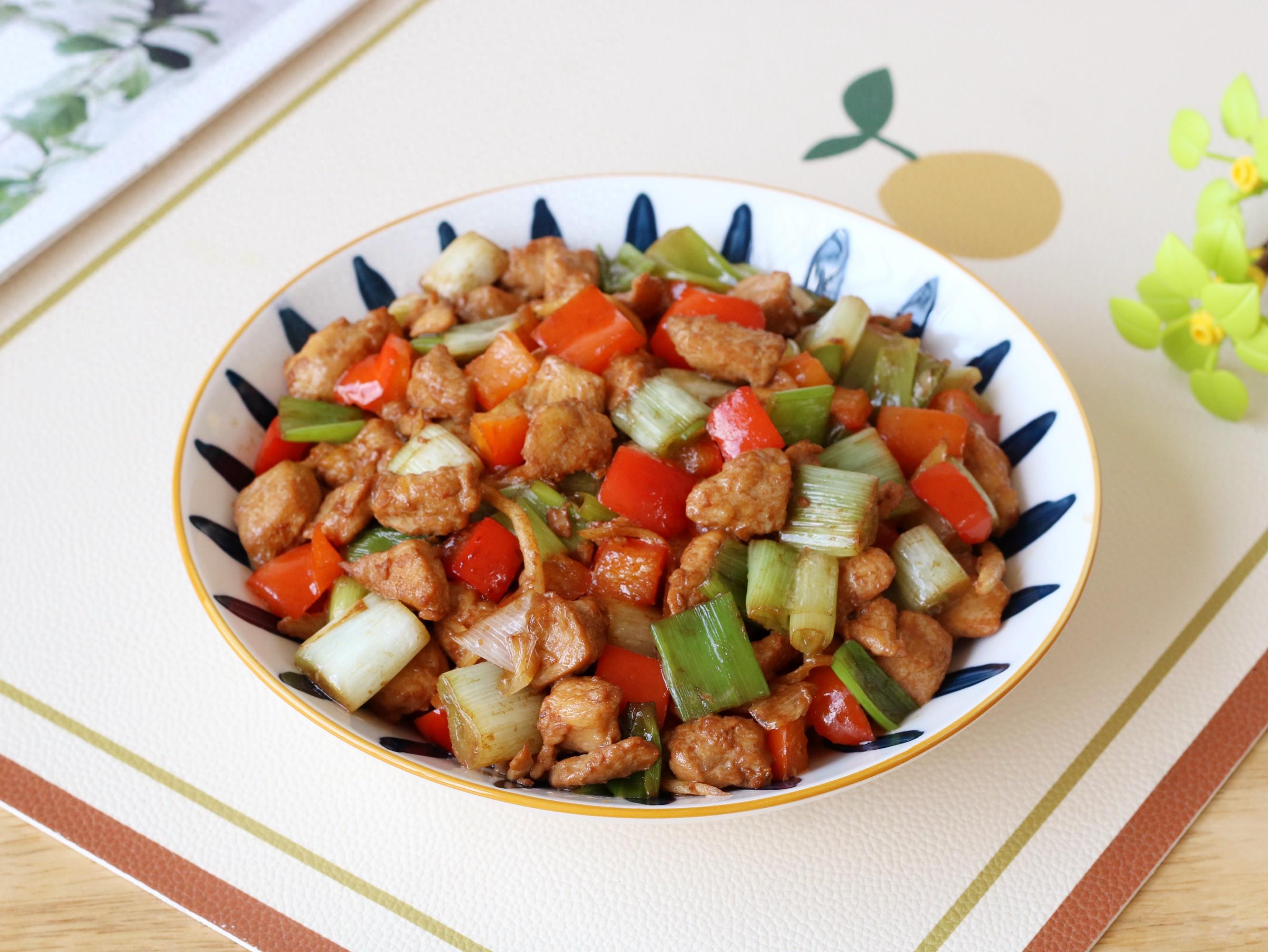 3,熱鍋放油,放入生薑熗鍋,加入雞胸肉翻炒到熟透,加入大蔥和紅菜椒翻炒均勻,加適量的鹽甜味。