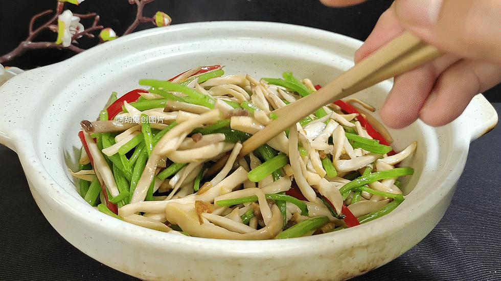 所用的杏鮑菇一定要經過焯水,冷卻後再擠幹水分,如此下鍋炒就不容易出水。直接下鍋炒會出現很多湯汁,影響這道菜的幹香味。