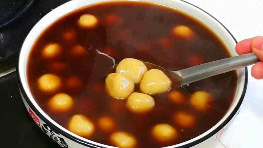 6.鍋中加入適量清水,大火燒開以後,再將小姜丸輕輕下入鍋中,煮至水再次沸騰時點入半小碗涼水,就跟我們平時煮餃子一樣,全程大約需要煮5分鐘左右,煮至小姜丸全都漂浮起來後,再倒入適量的紅糖,紅糖的量根據自己的口味添加,可以少量多次加,加完後用勺子盛出一點嚐嚐口感,不合適再加,然後繼續煮至紅糖化開後關火,不要着急出鍋,燜上2分鐘左右,讓小姜丸充分吸收紅糖的香甜,然後就可以出鍋裝碗了。