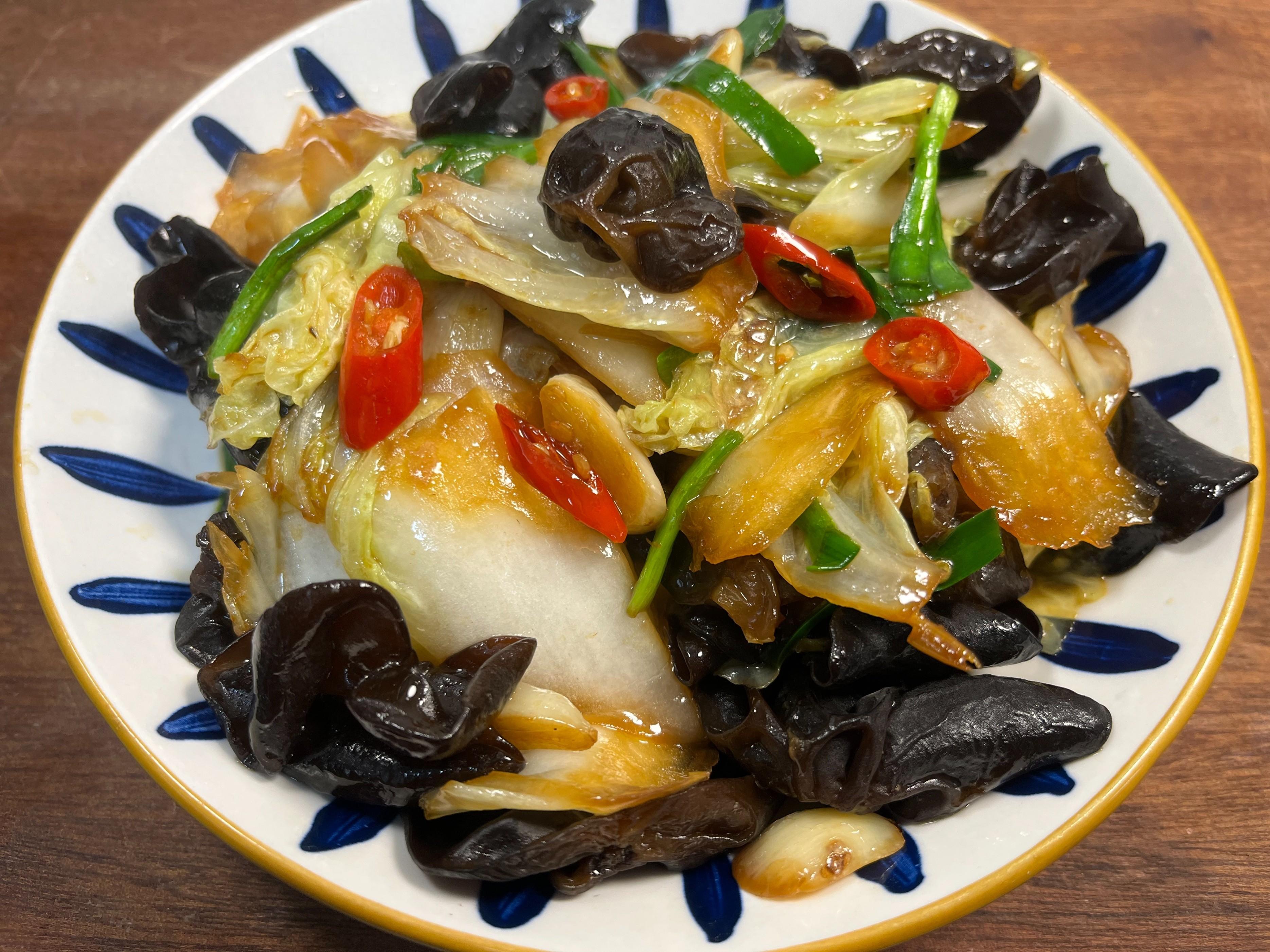 ④ 倒入木耳和白菜葉,加生抽、鹽快速翻炒;