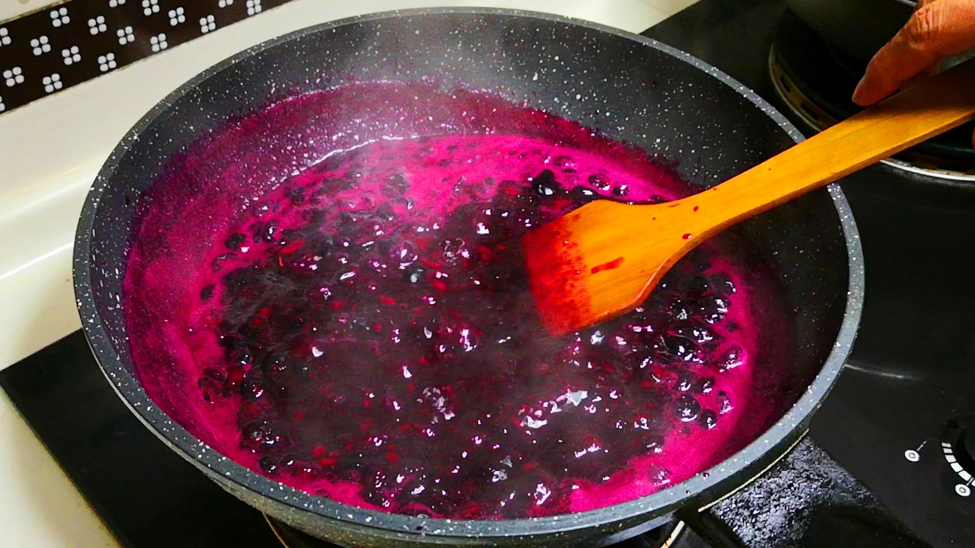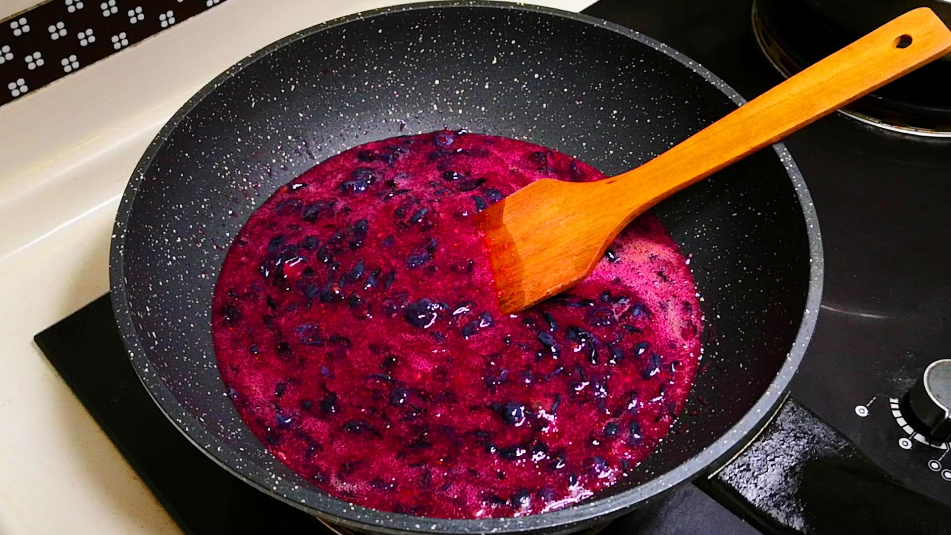 3.待藍莓煮至出汁變軟後,再用鏟子將藍莓輕輕壓扁壓碎,讓其釋放出體內的果汁,然後繼續不停地攪拌熬煮。