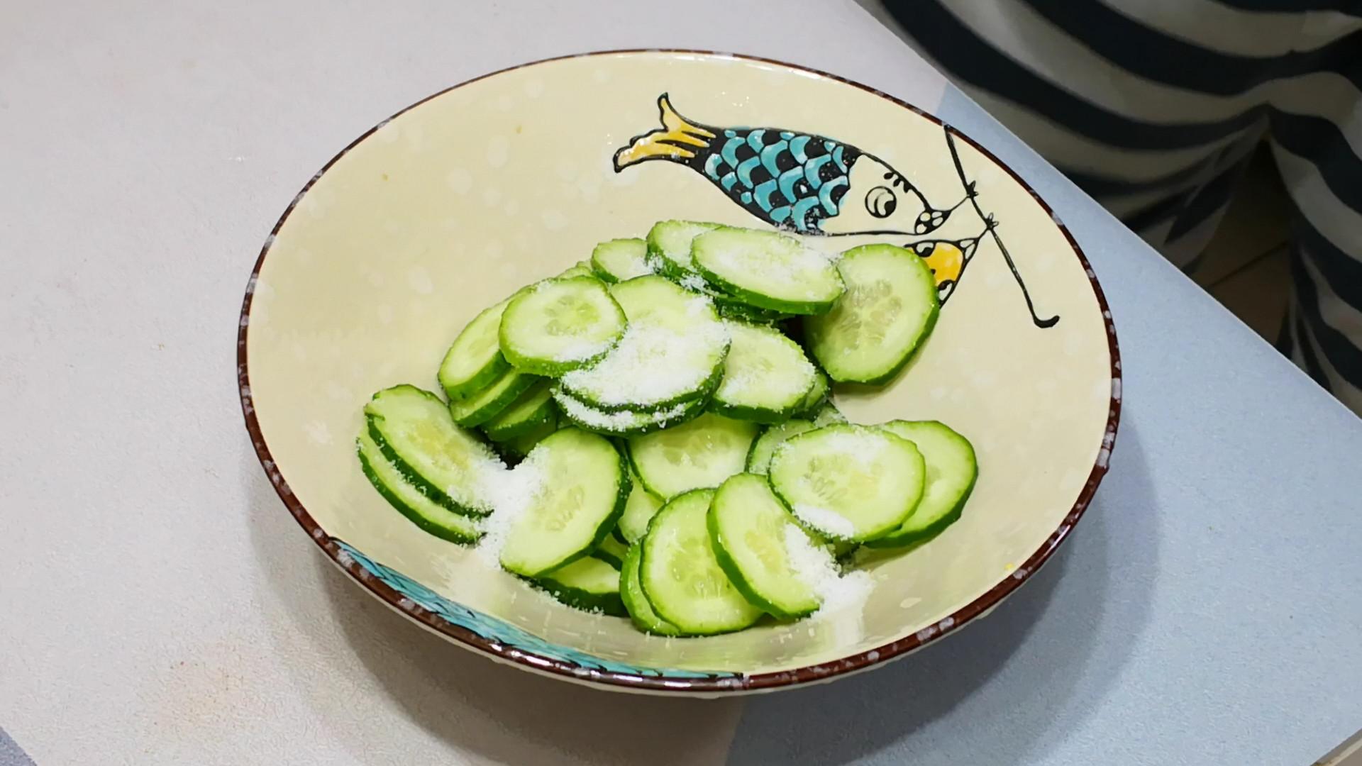 1.黃瓜一根洗淨後切掉頭和尾,然後再切成薄薄的片,切好後放入大碗裏,加入一點食鹽,攪拌均勻後醃製10分鐘,這樣醃製後的黃瓜口感更脆嫩。