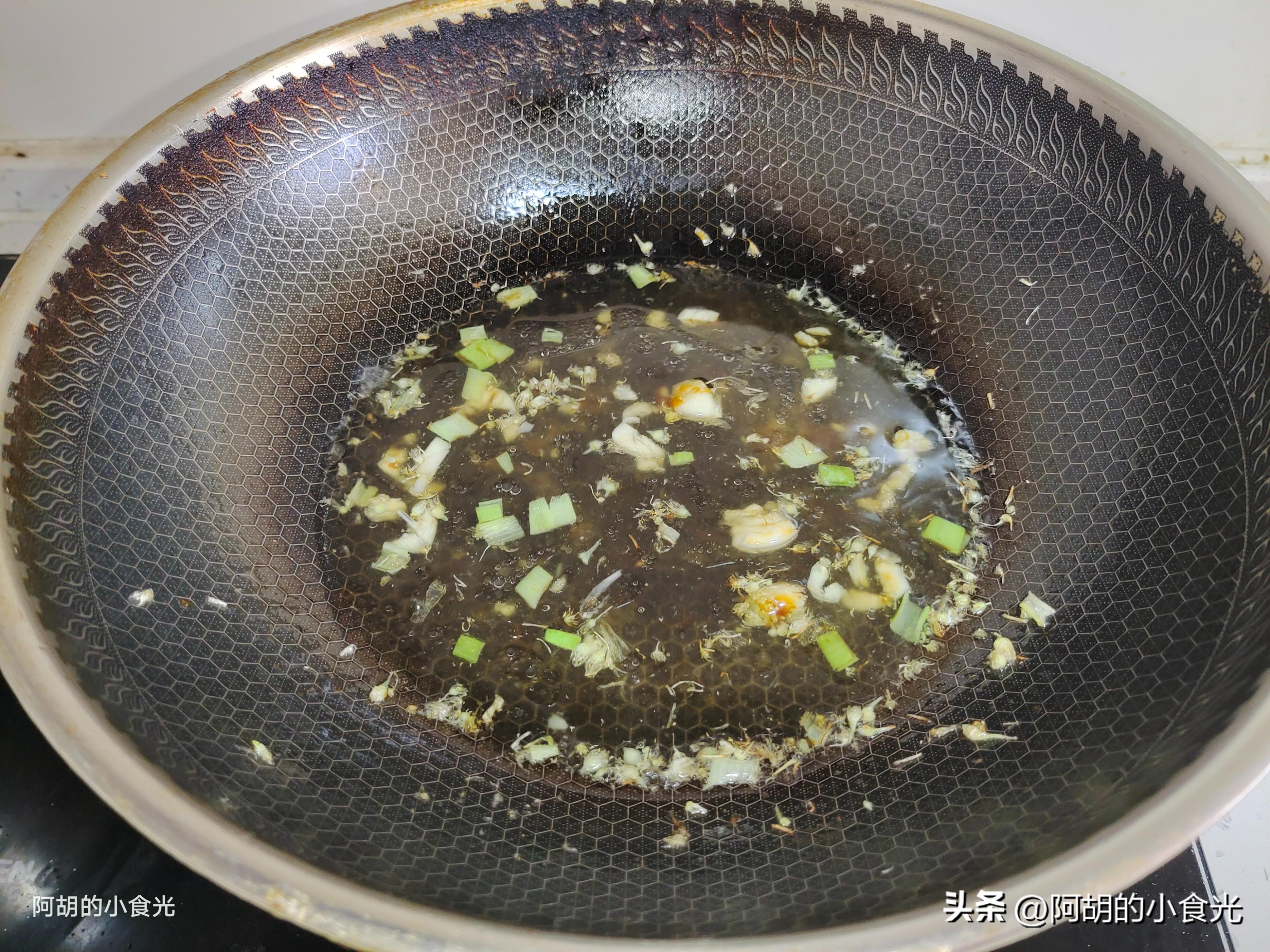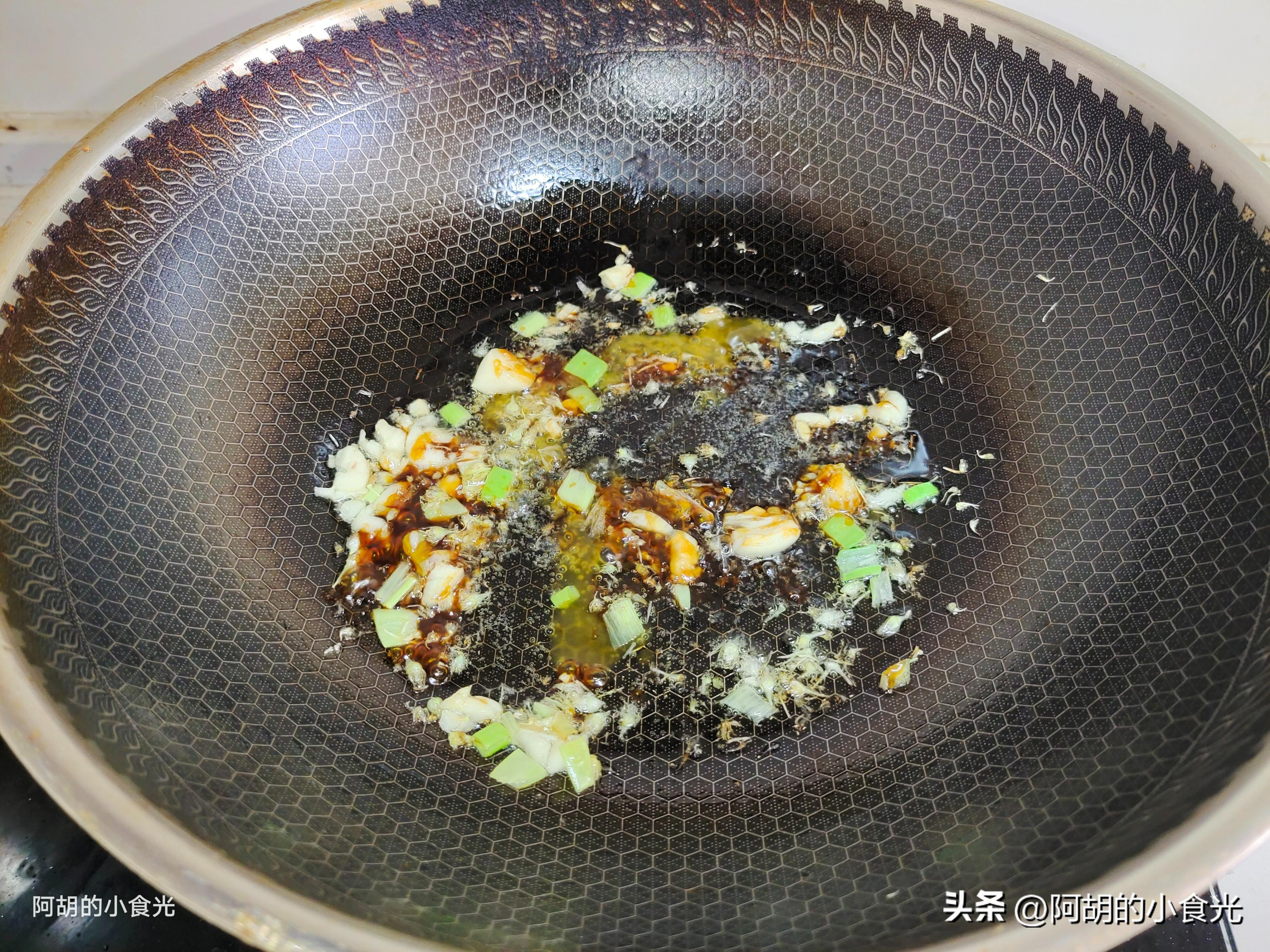 第四步:另起鍋燒油,油熱後撒入蔥蒜末炒出香味,接着淋入適量的蠔油小火炒出香味,再直接衝入適量的開水,攪拌一下小火煮開。