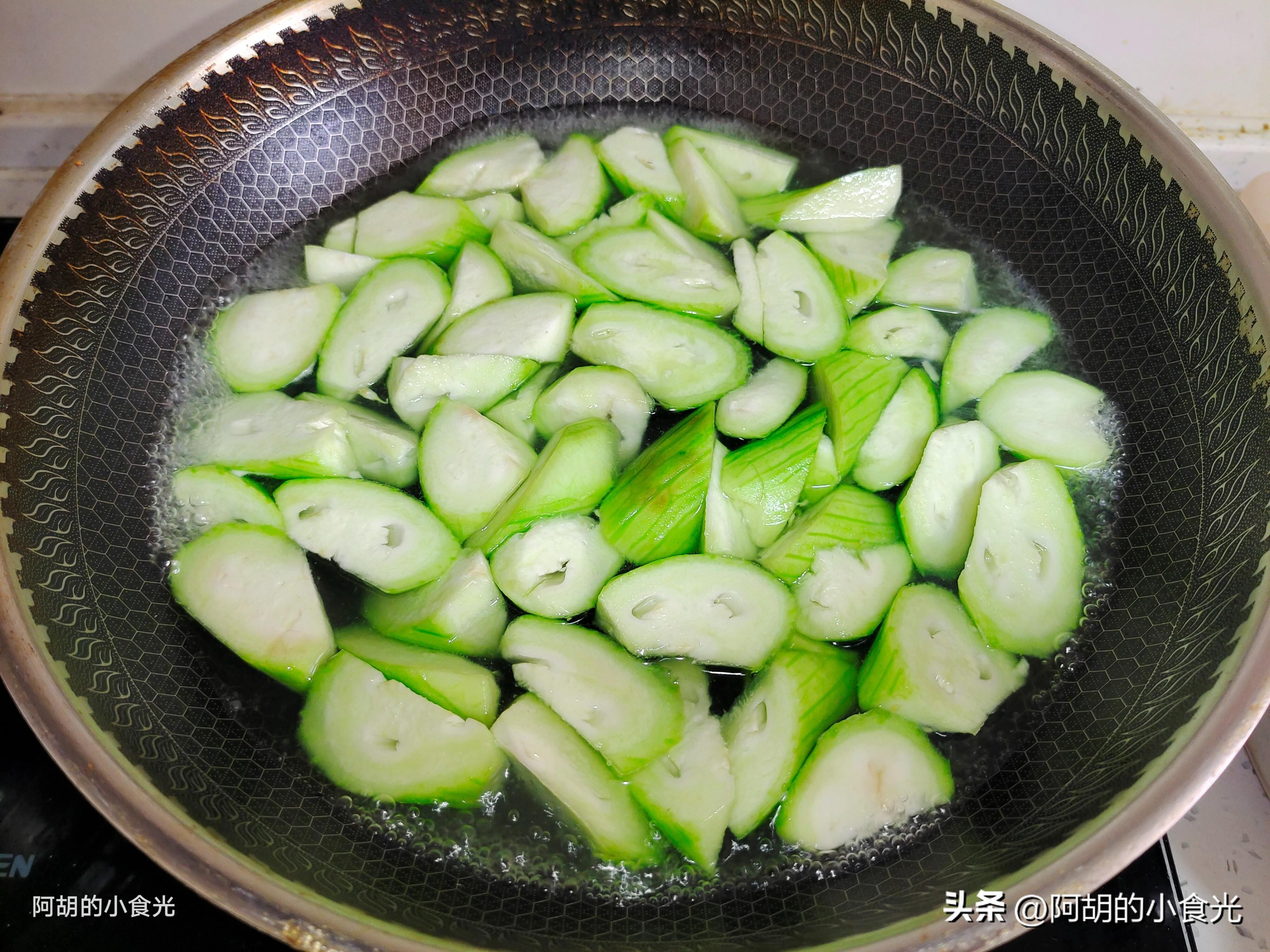 第三步:所有食材準備完畢後就可以開火烹飪了。因爲今天這道菜的絲瓜需要靠後加入,爲了炒的時候能夠夠快速熟透,所以也需要先將絲瓜來個焯水。只要燒一些開水,保持大火沸騰淋入少許食用油,而後將絲瓜塊倒入其中,焯燙二十秒鐘左右就撈出即可。