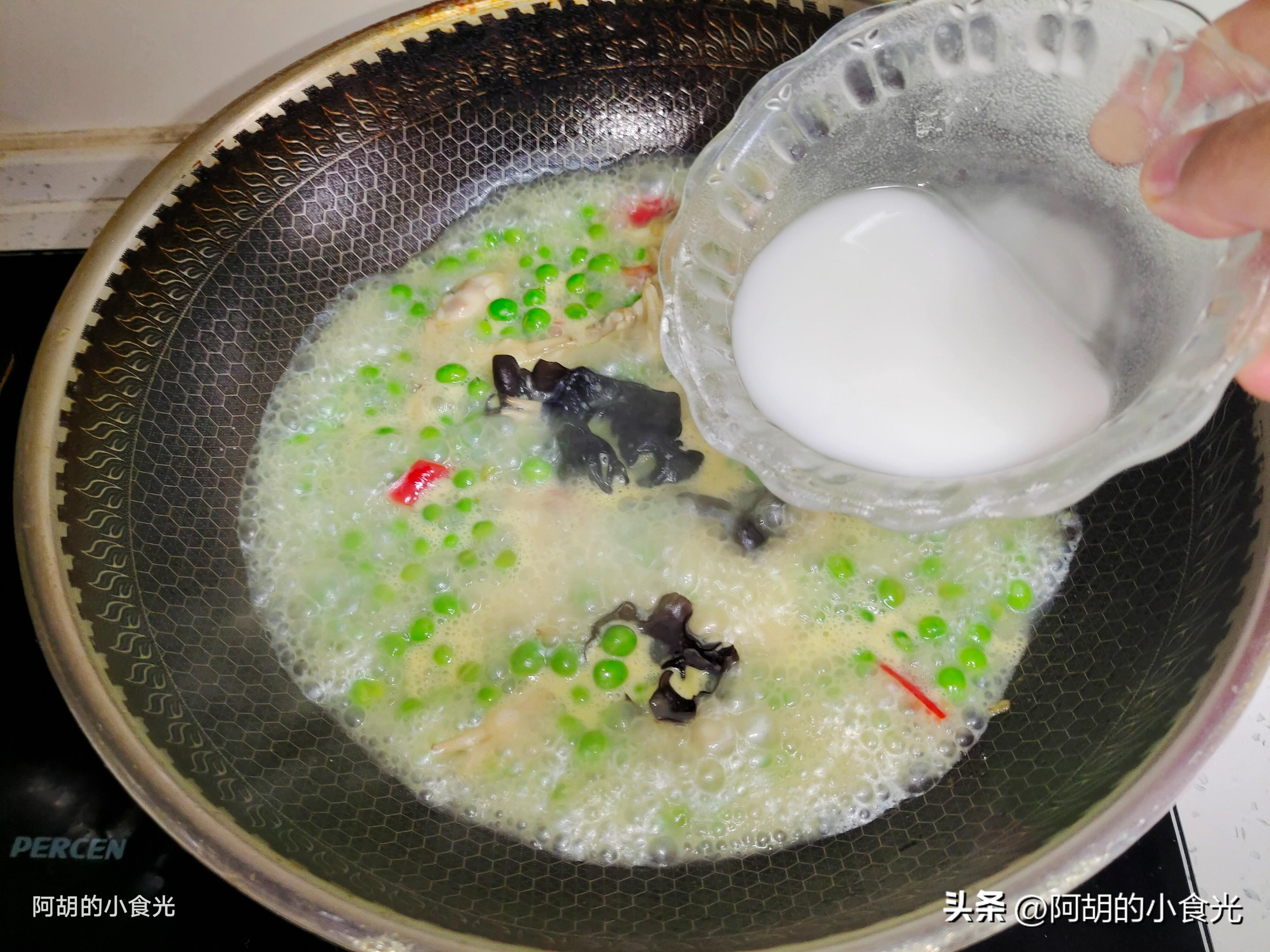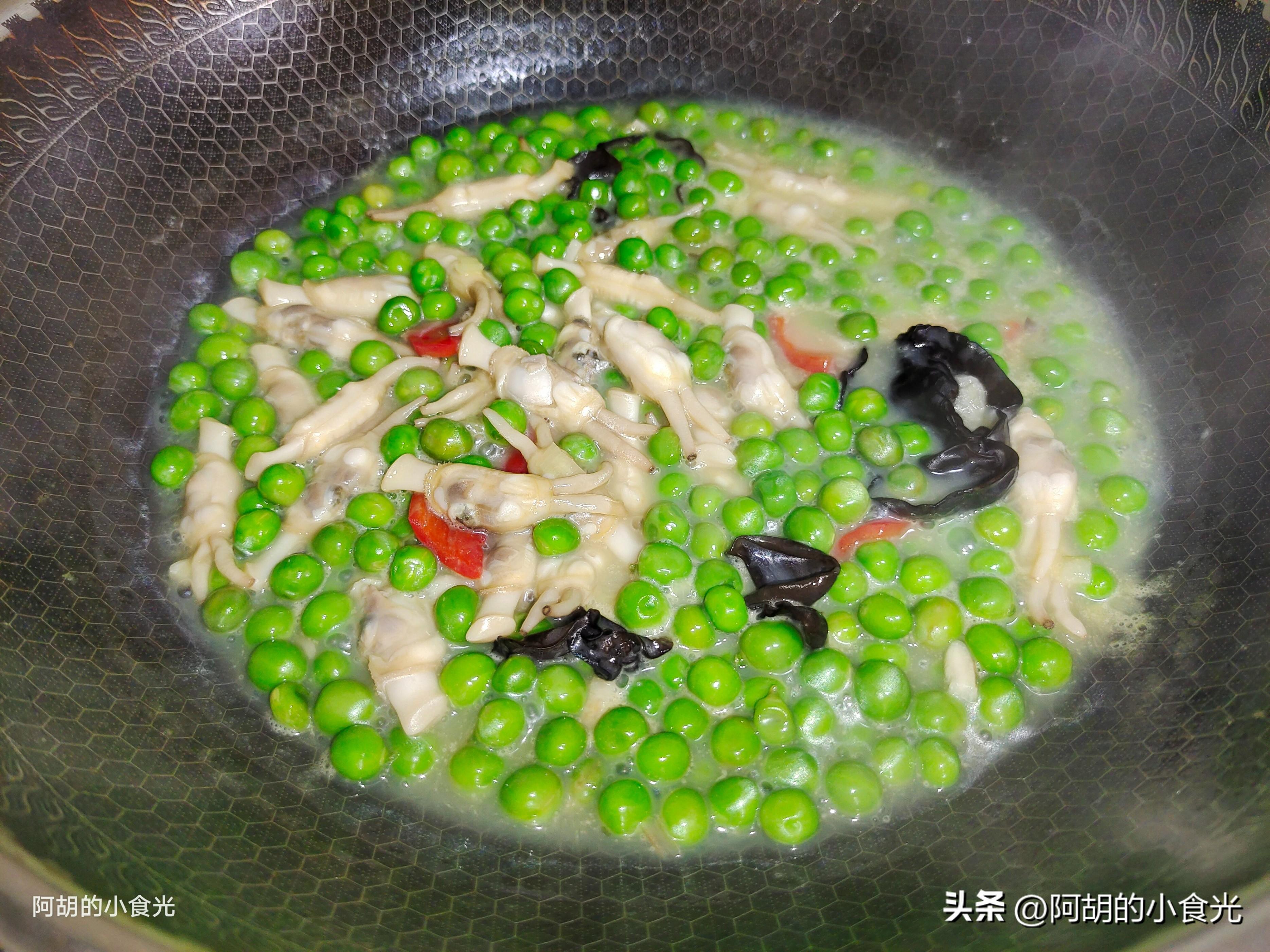 第七步:取出用涼水稀釋的澱粉水,慢慢地淋入鍋中,一邊保持大火用勺子攪拌,直至湯汁略微濃稠能裹住食材的程度即可關火出鍋。極度鮮爽的一道小菜,甜嫩的豌豆仁,肥美的蟶子肉,每一口都是鮮美的味道,感興趣的一定要試一試這個搭配喫法。