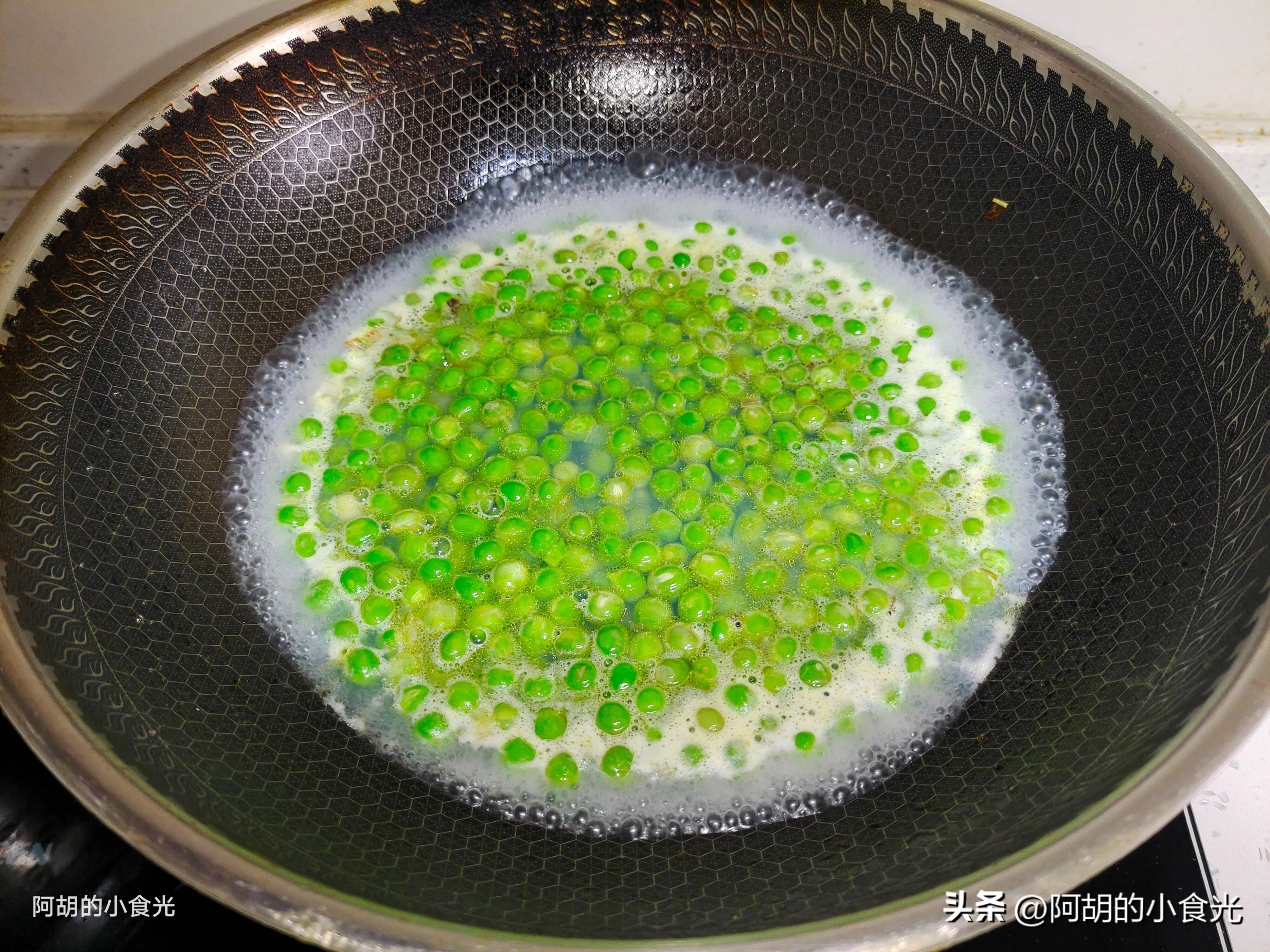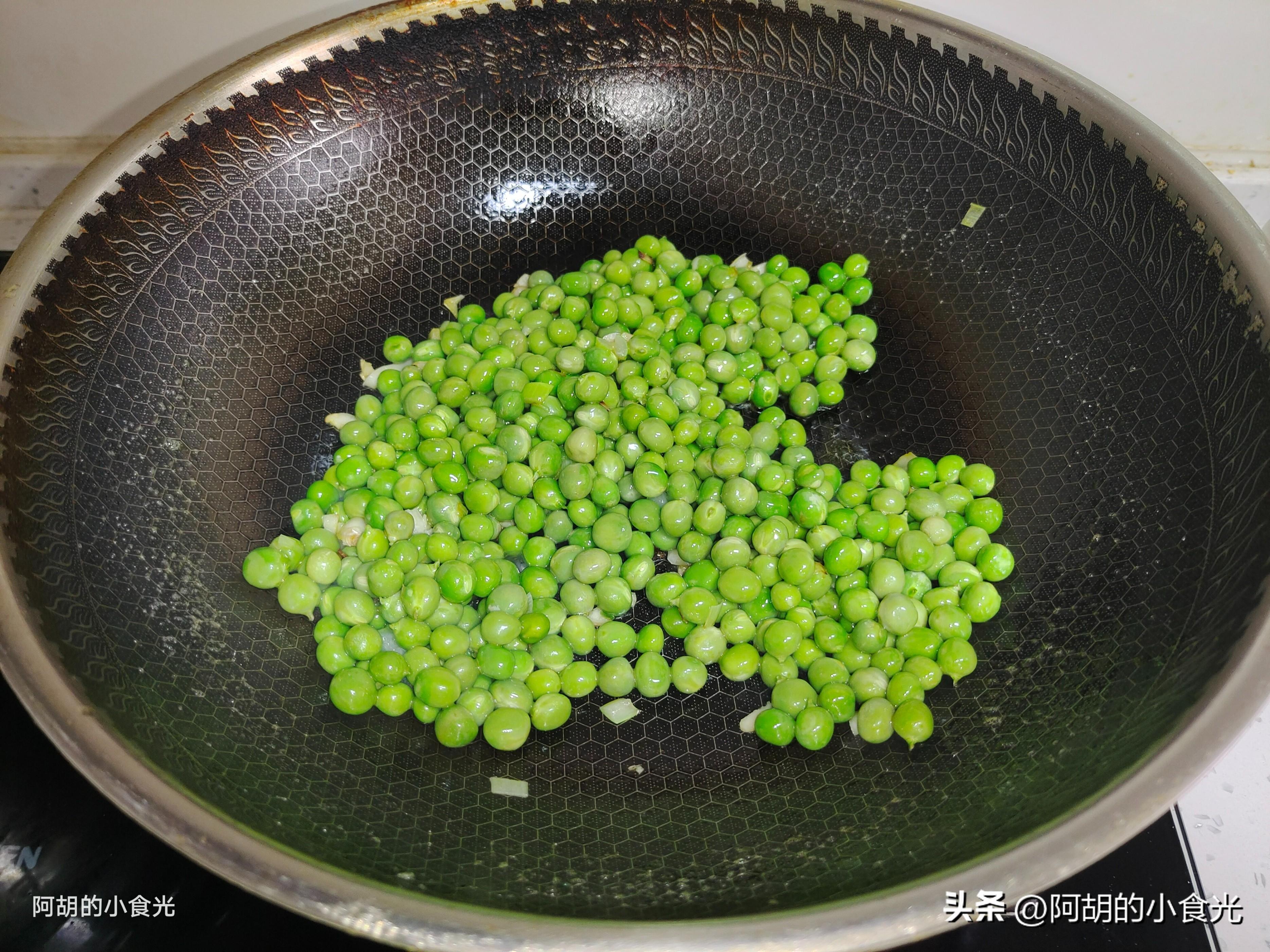 第四步:所有食材準備完畢後就可以點火烹飪了。先把鍋燒熱,淋入適量的菜籽油燒熱,將小料蔥薑蒜倒入鍋中小火炒出香味,接着將鮮豌豆仁倒入鍋中,轉爲大火炒一炒。