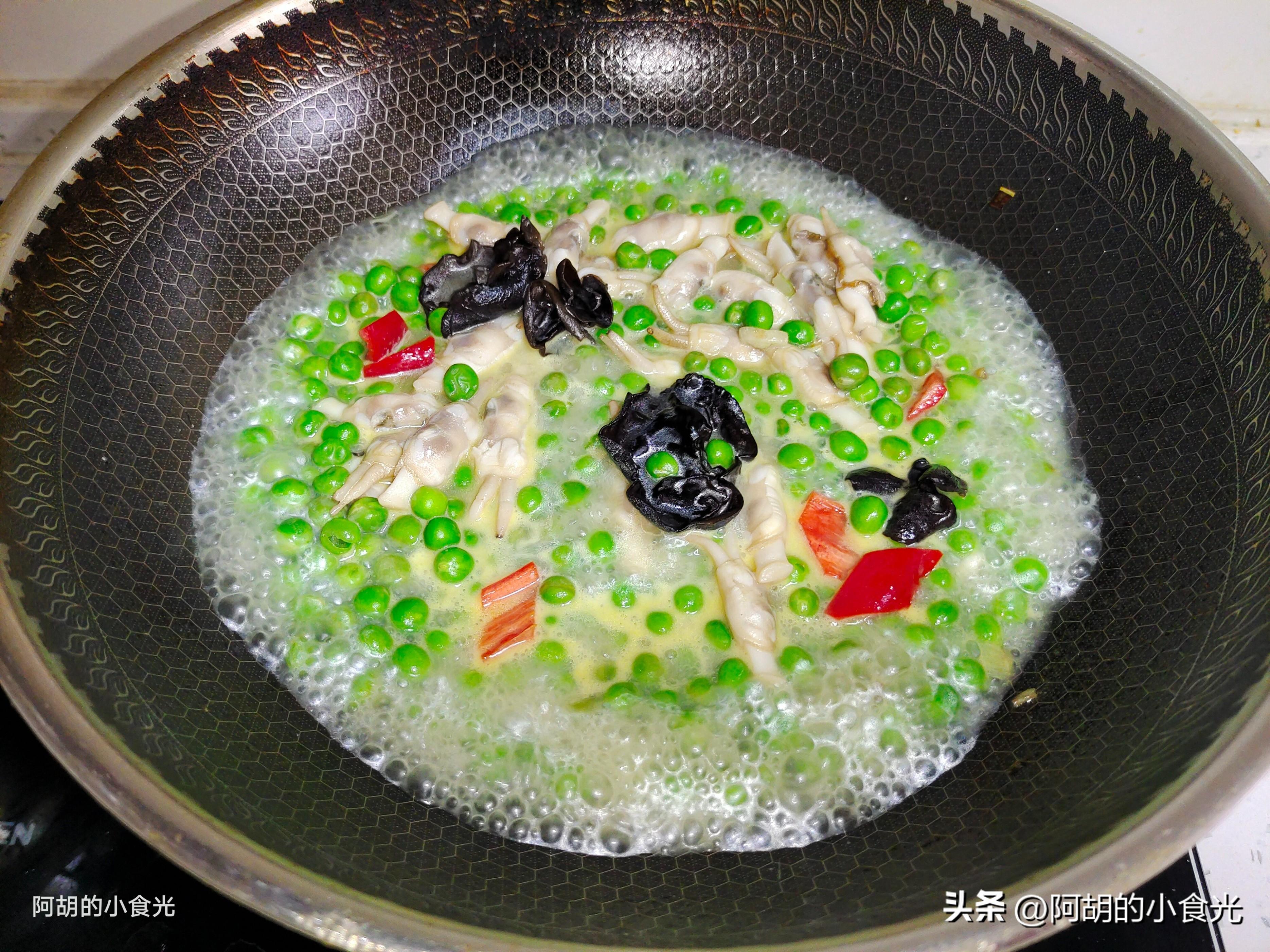 第五步:取出第二步中的煮蟶子湯倒入鍋中,不夠的可以再添入一些開水,保持大火煮開,再將木耳也下入鍋中一塊煮個五六分鐘左右,將豌豆仁煮熟煮透爲止。