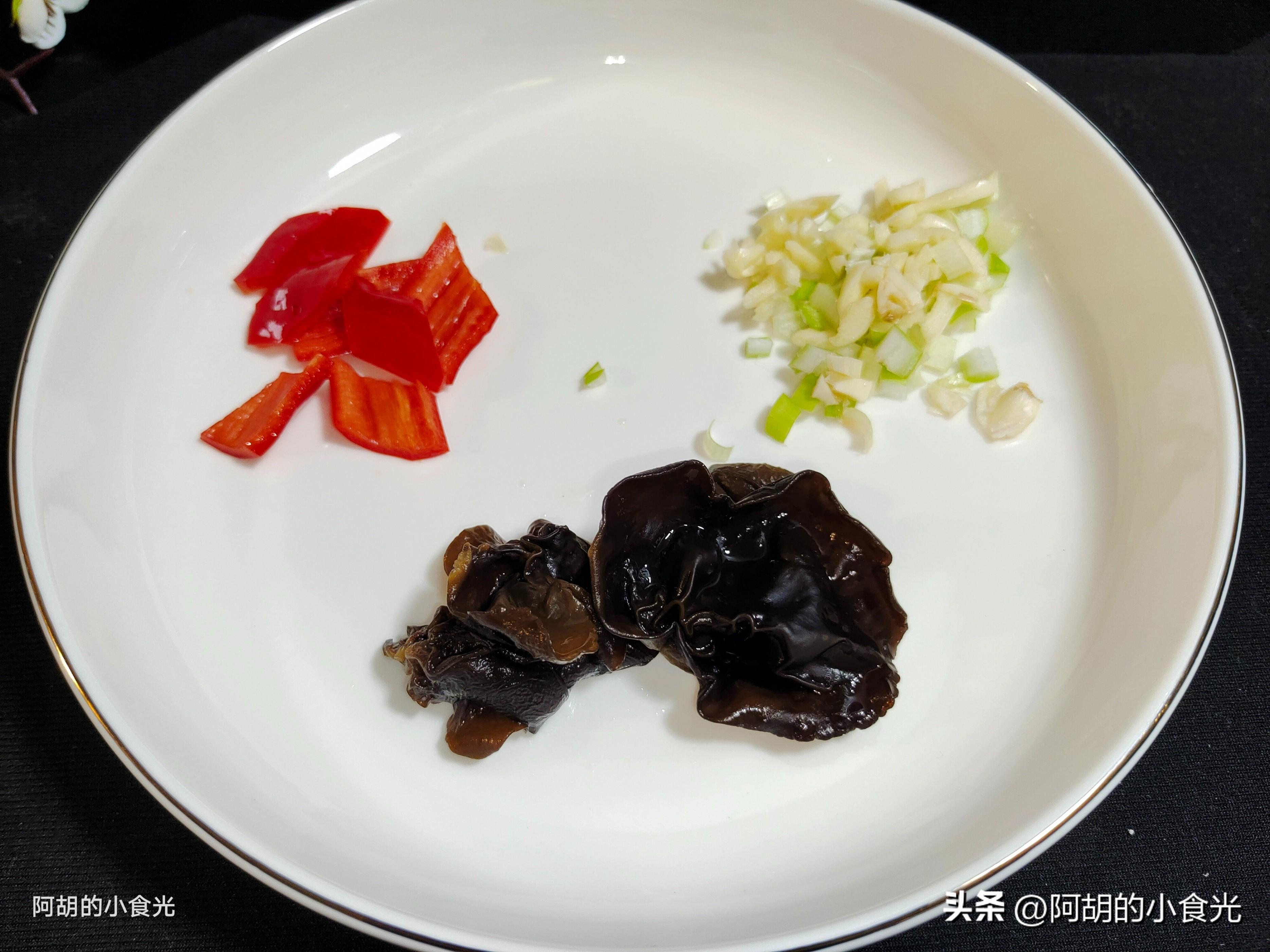 第三步:準備少許的配菜和輔料,有少許的幹木耳用涼水泡發,一小塊紅椒切菱形片用來搭配顏色,再有適量的蔥薑蒜作爲小料使用。