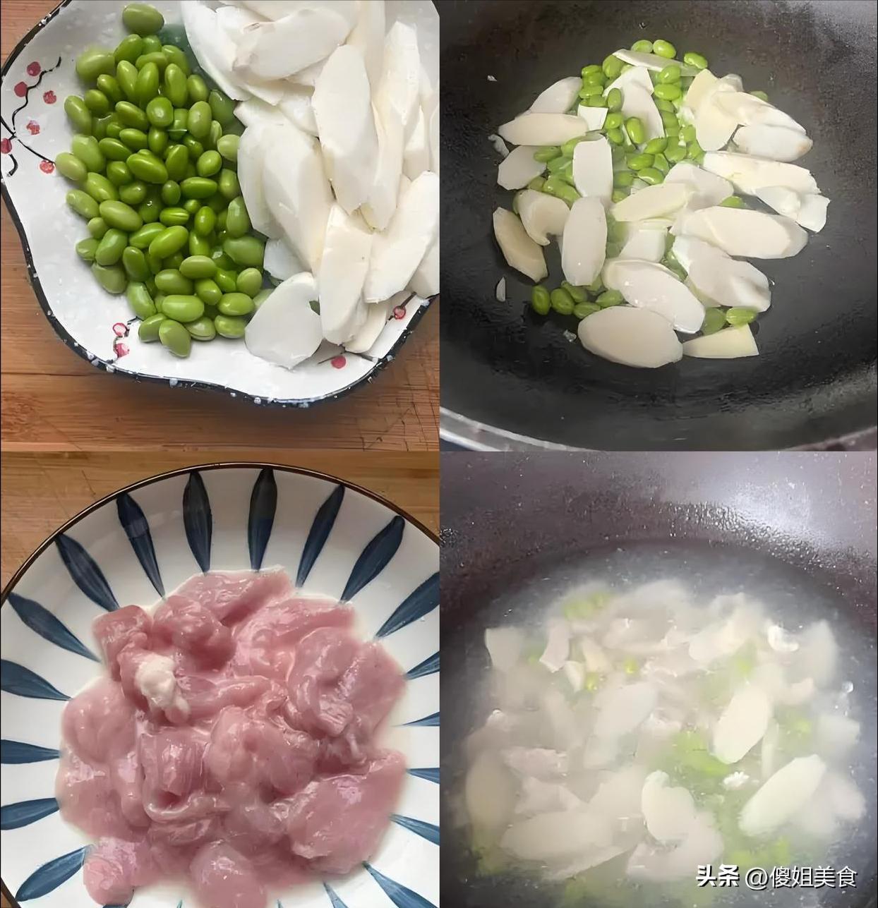 - 毛豆仁焯水2分鐘撈出,裏脊肉切片用胡椒粉+澱粉抓勻