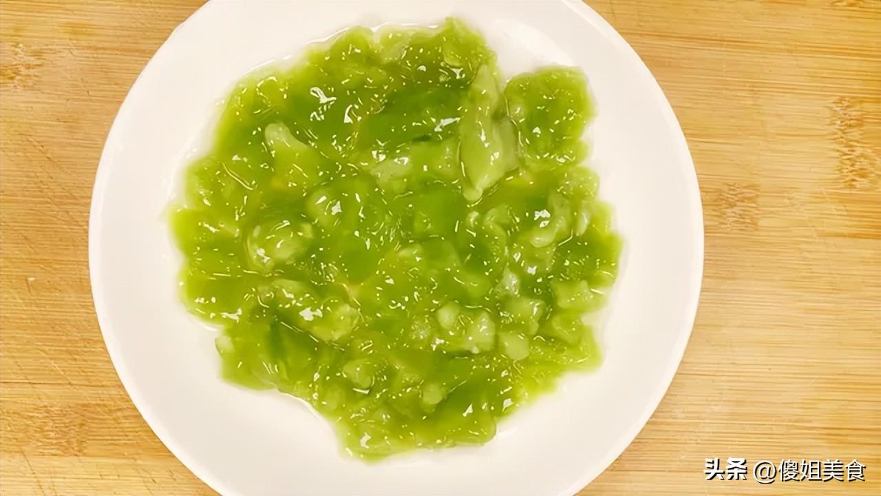 2、黃瓜切塊榨汁,過濾掉渣渣(渣別扔!加酸奶就是夏日特飲)。黃瓜汁300ml+清水300ml+豌豆澱粉100g,攪勻至無顆粒。小火慢煮!邊煮邊攪,直到變透明粘稠糊糊(約5分鐘),倒進碗裏晾涼,冷藏2小時定型。涼粉扣出後,刀蘸冷水切條,Q彈得能duang duang晃~