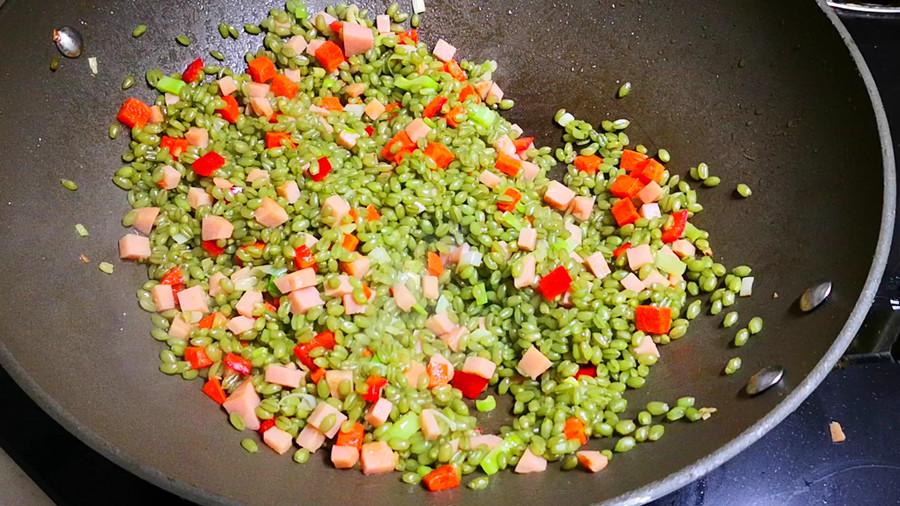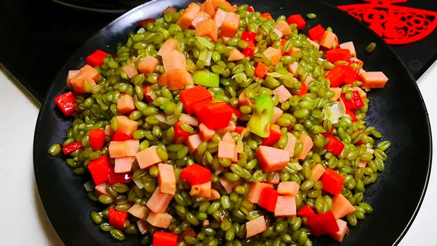 4.起鍋加油,燒至鍋熱油熱後下入蔥花和蒜片,炒香後再倒入青麥仁、胡蘿蔔丁、火腿丁和青紅椒丁,翻炒片刻後加入一點鹽、適量的白糖、少許生抽和胡椒粉,再繼續翻炒一會兒,讓各種食材的鮮香味相互融合後,就可以出鍋了,太香了!