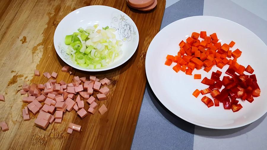 2.再準備一些配料:火腿一塊切成小丁;青紅椒各適量去籽後也切成小丁備用;然後再取一塊胡蘿蔔切成小丁備用。配料食材可以根據自己的喜好選擇,主要是爲了搭配顏色、豐富營養。