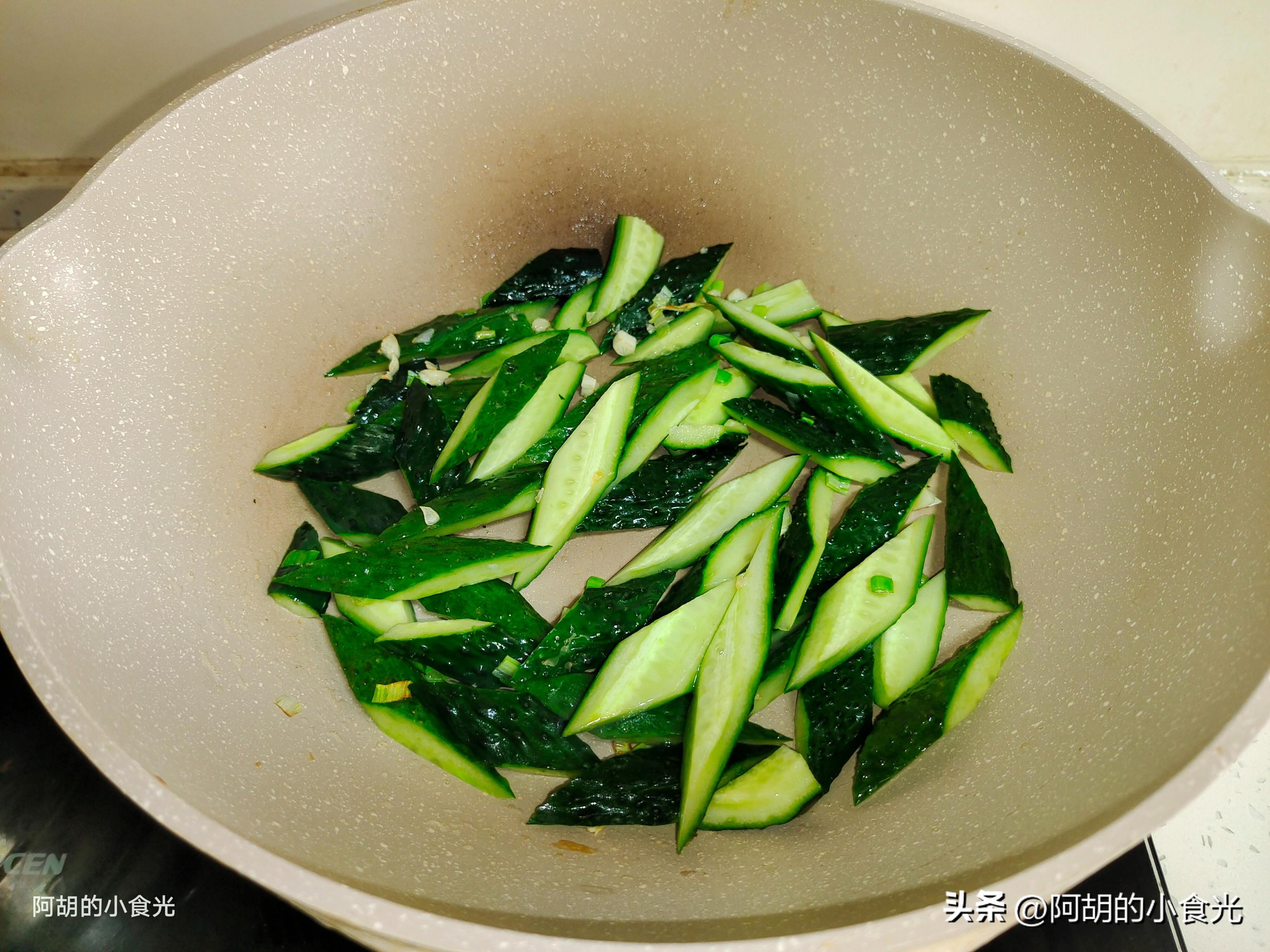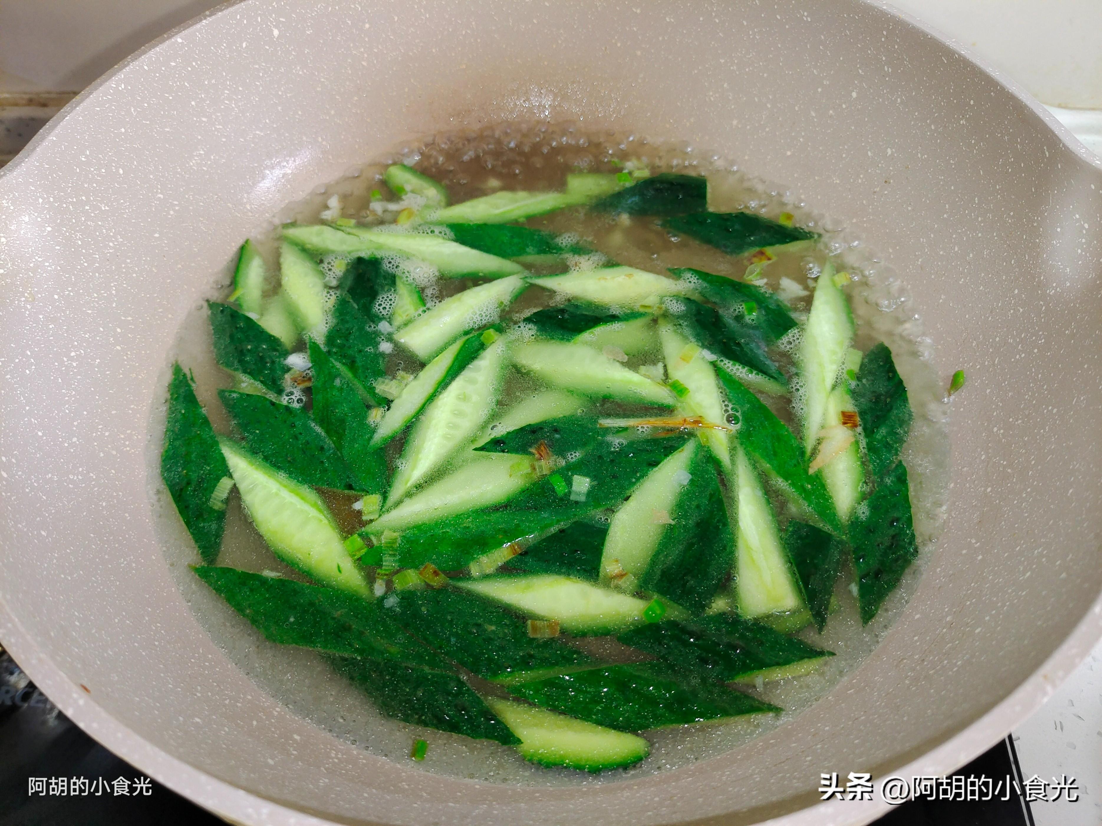 第五步:鍋烘乾,淋入少許的花生油燒熱,把蔥花下鍋炒出香味,而後將黃瓜片倒入鍋中,轉爲大火翻炒十幾秒鐘左右。往鍋中添入開水適量,大火將其煮開。