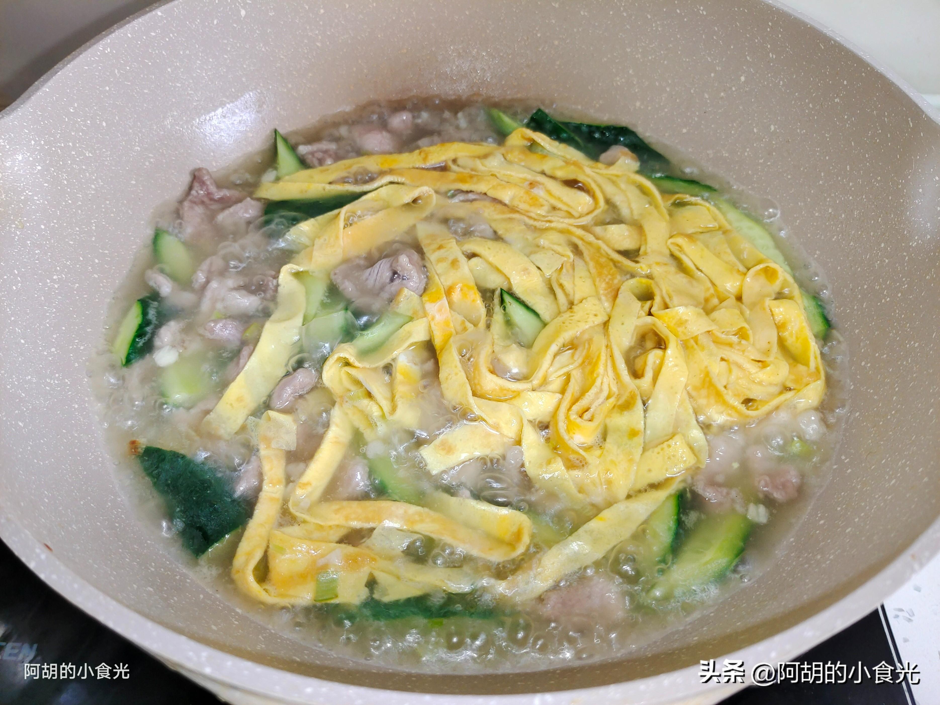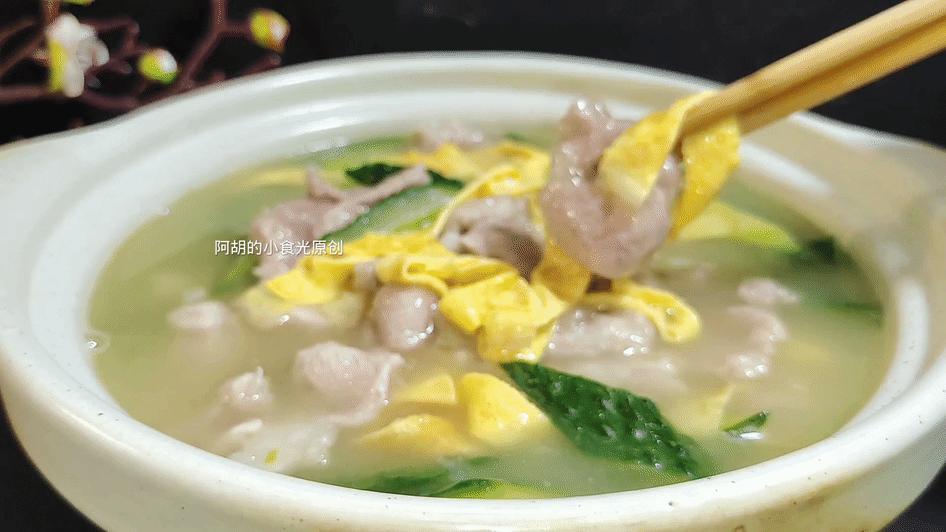 第七步:取出雞蛋皮倒入鍋中,撒入一些食鹽、松茸鮮和胡椒粉,攪拌一下再煮個一兩分鐘就可以出鍋裝盤了。肉片滑嫩入味,湯汁清爽又鮮美,一口就能開胃,不知道喫什麼時不妨先試一試這道湯。