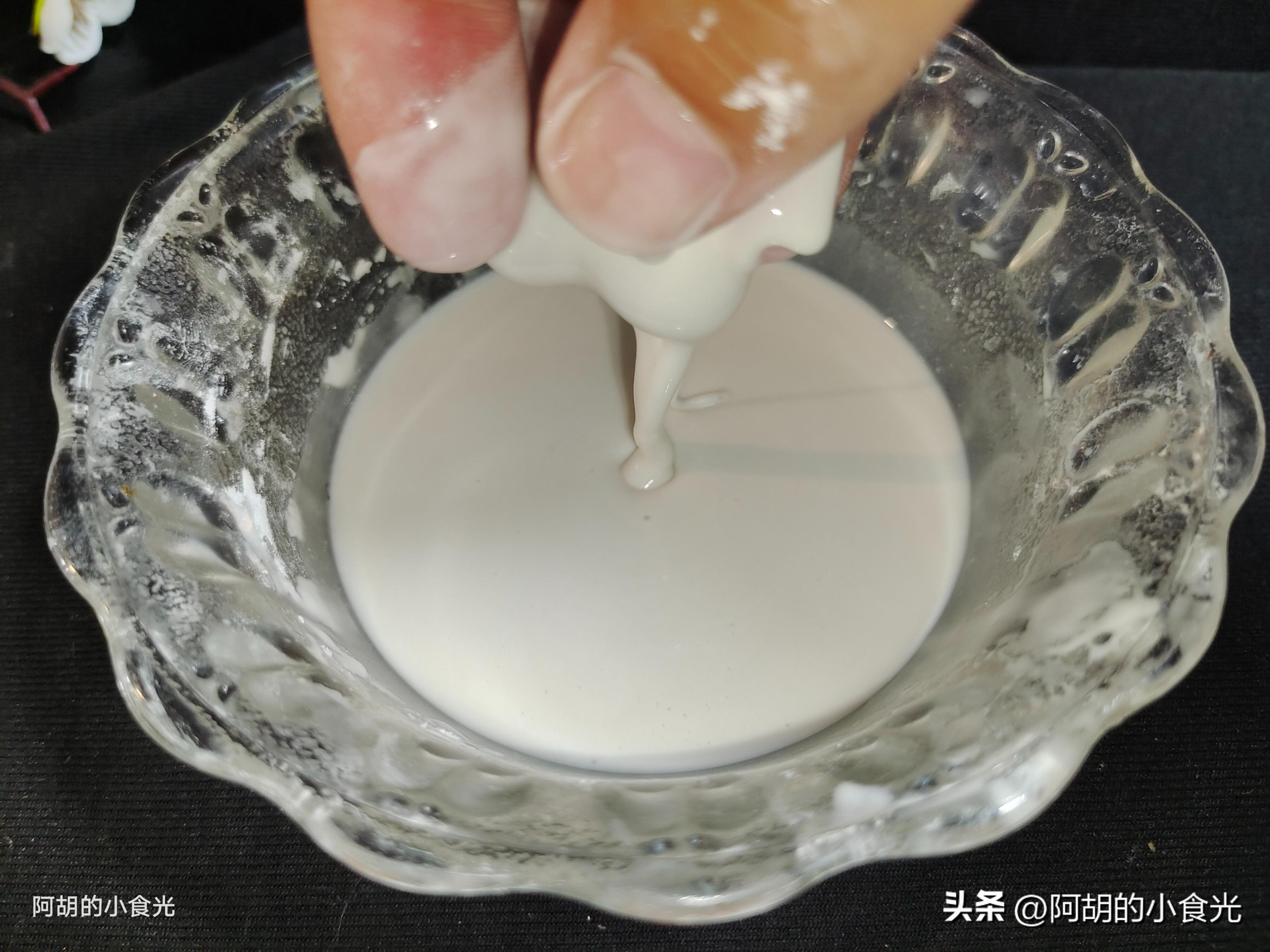 第二步:重點來處理今天的滑肉,先在空碗中加入兩湯匙的紅薯澱粉,量要稍微多一些。而後加入少許的清水攪拌均勻,水量不要太多,要讓粉漿呈現用手抓起後滴落成絲的狀態即可。