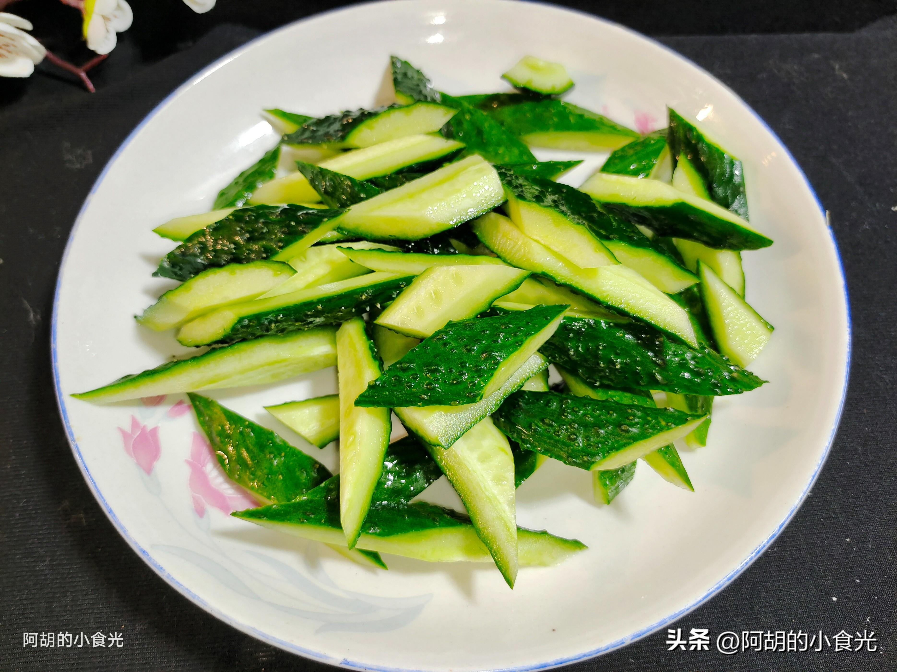 第一步:先來準備新鮮的黃瓜兩根,用流水搓洗乾淨表面,而後把黃瓜從頭到尾剖開成四份,再把瓜瓤也去掉,最後將瓜肉切成菱形片備用。