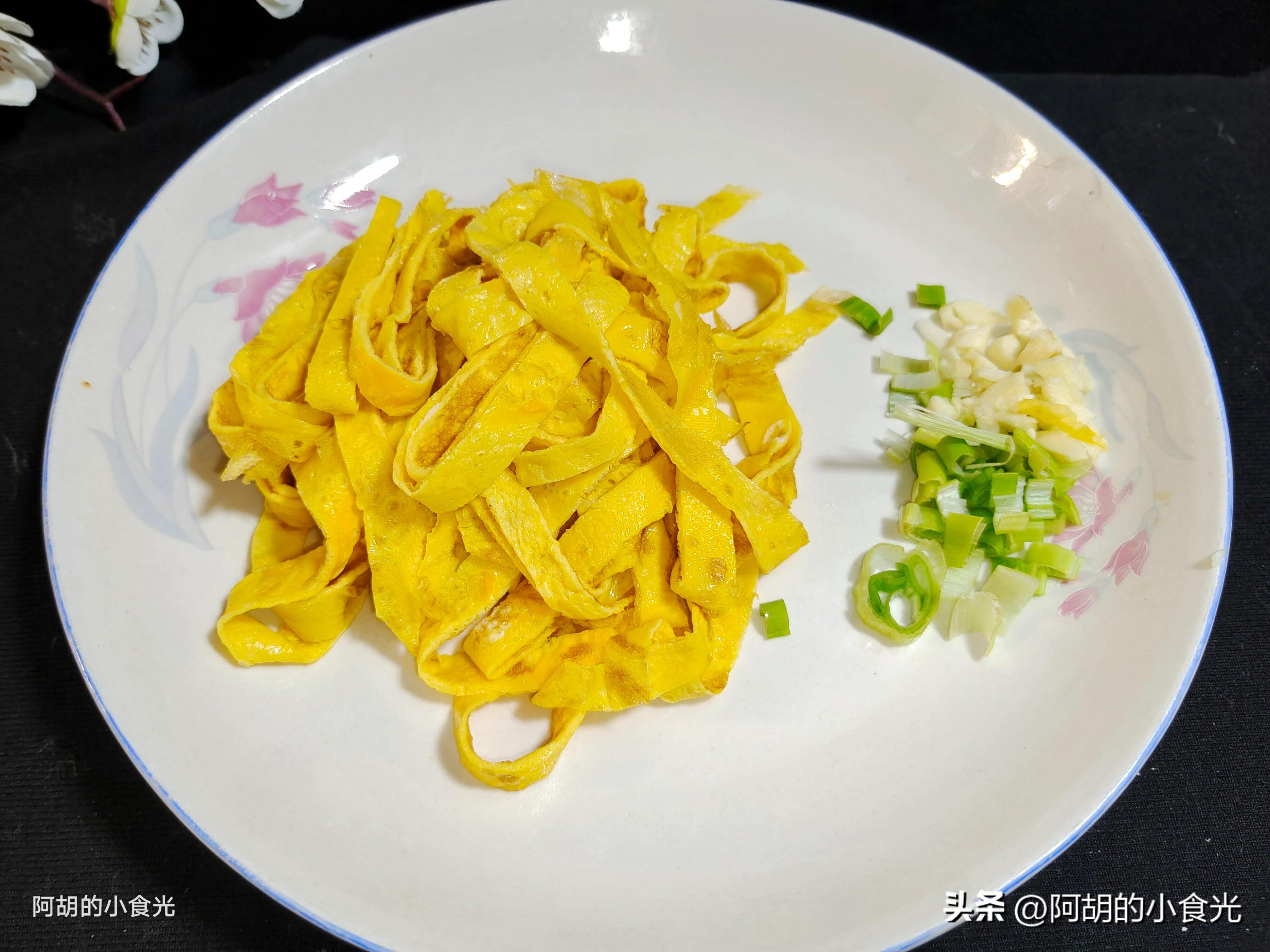 第四步:還需要準備兩個雞蛋打散,淋入少許的澱粉水攪拌均勻,而後再將蛋液用不粘鍋攤開成兩片雞蛋皮,再將蛋皮切成長條待用,順便切一些蔥花用來作爲小料。