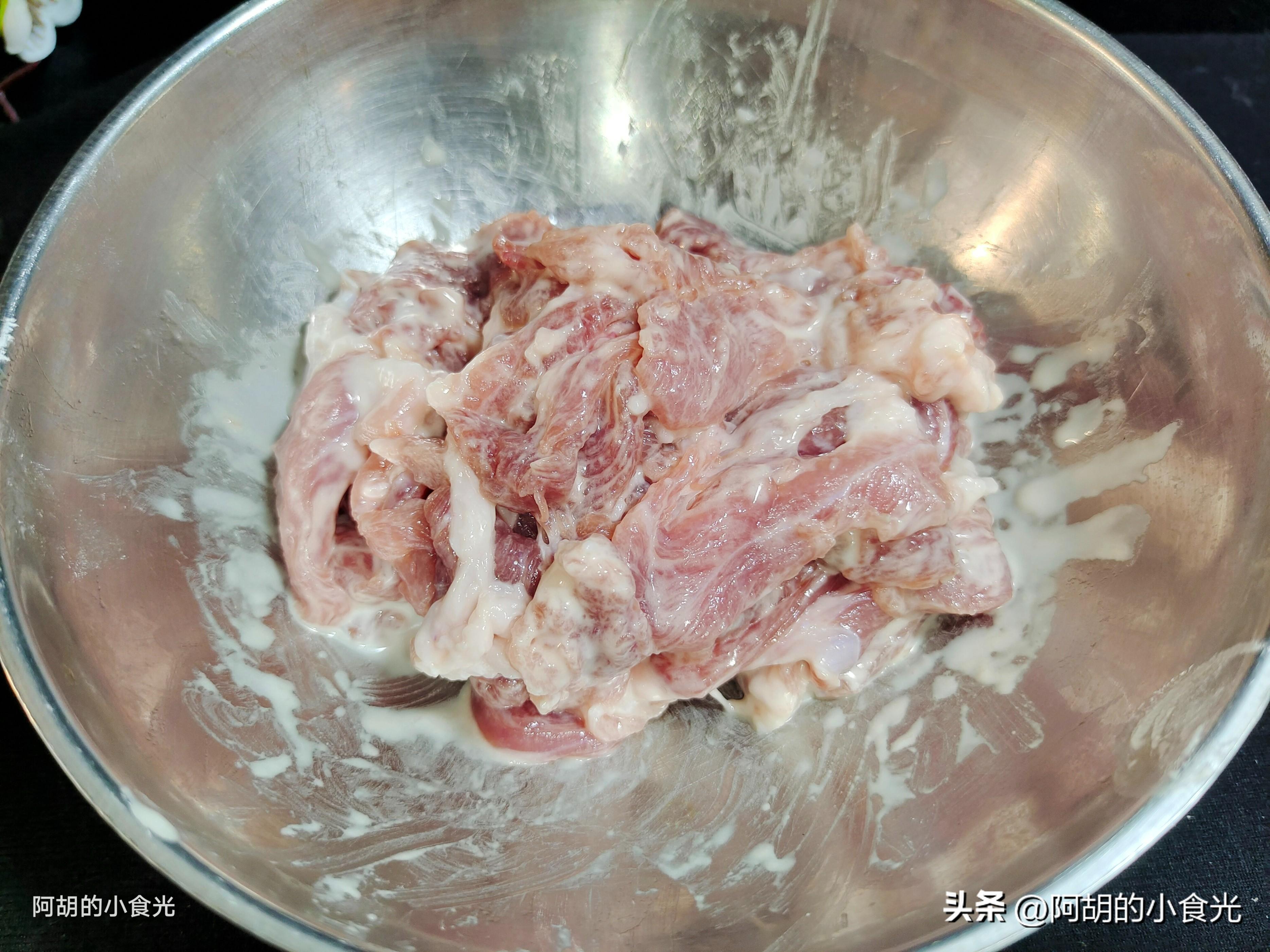 第三步:準備一塊豬瘦肉,今天採用的是梅花肉的部位,瘦肉中帶有一些脂肪紋路比較鮮嫩。把瘦肉切開成片放入碗中,加入一些食鹽、松茸鮮或者蠔油抓拌均勻。而後將上一步中調製好的粉漿也倒入其中攪拌均勻,讓每一片肉都能裹滿澱粉粉漿。