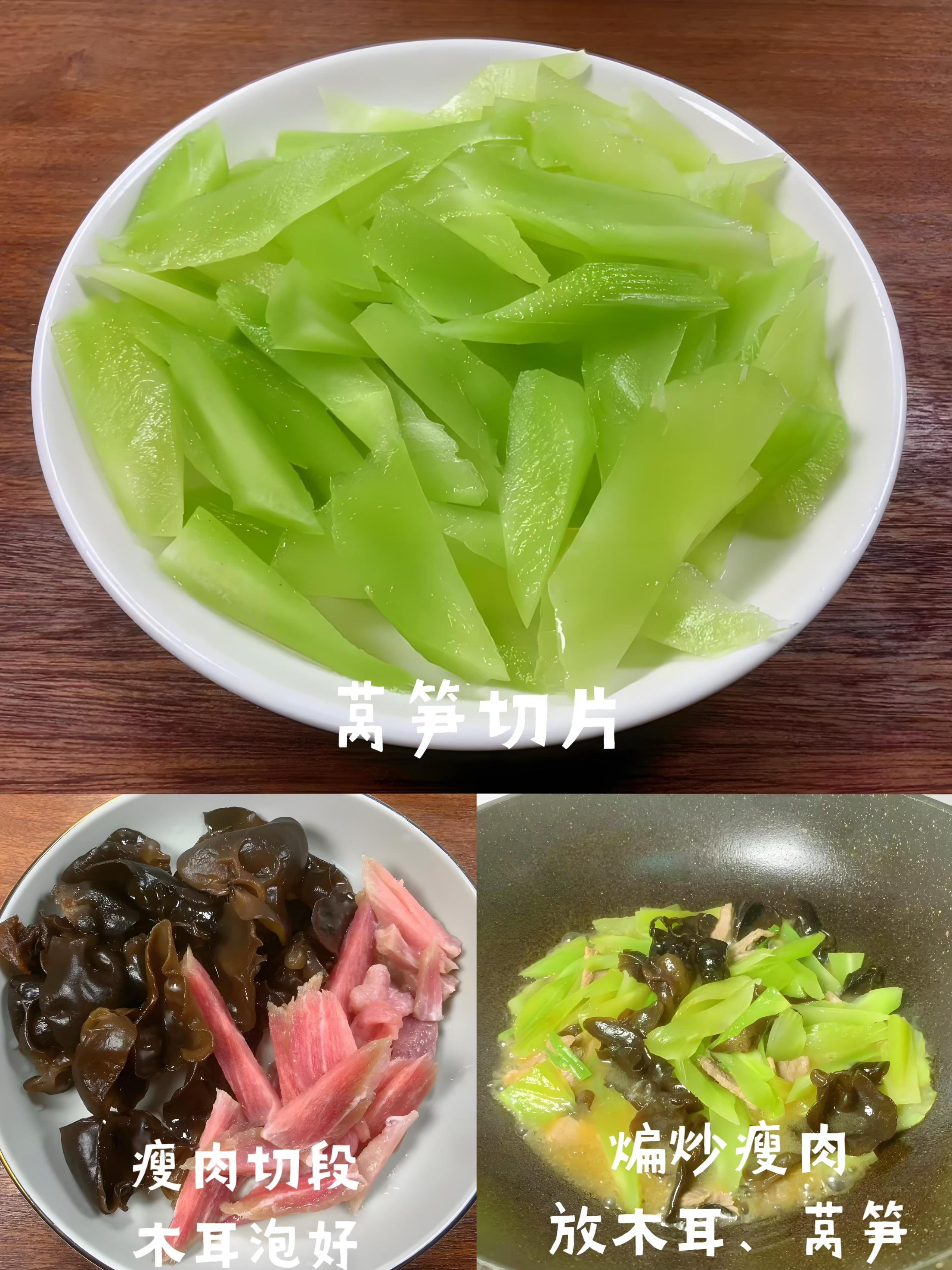 泡發木耳1碗(別用熱水泡!冷水泡3小時才脆)、萵筍半根、瘦豬肉100g、蒜片3瓣