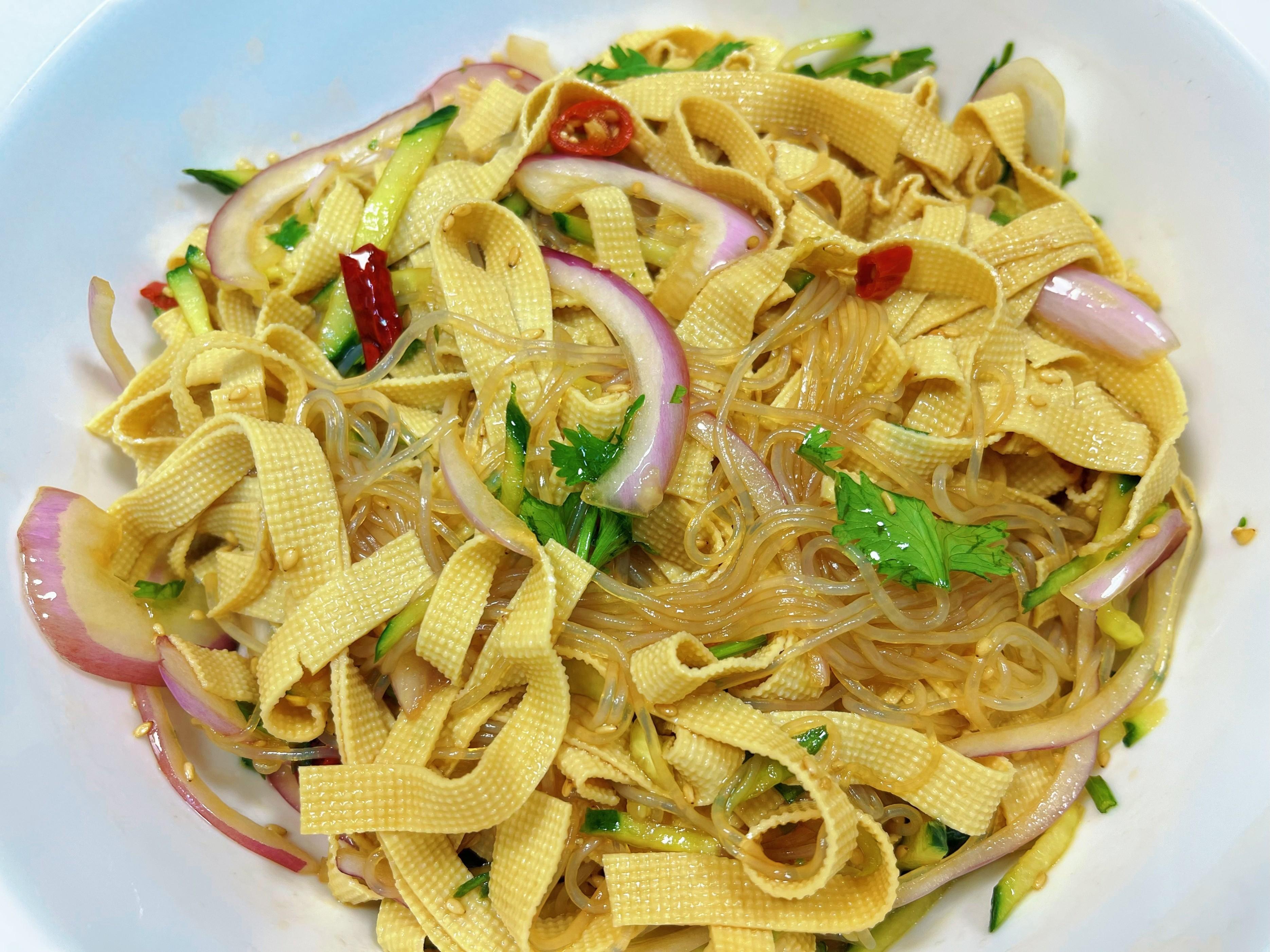 1、豆皮用溫水泡10分鐘,展開切成細絲(像掛麪那麼細才入味),開水裏焯30秒撈出來過涼水