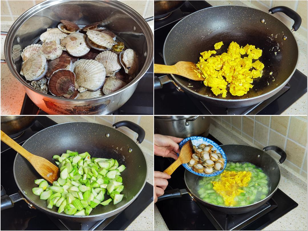 食材:絲瓜2根、扇貝15顆、雞蛋2個、鹽、胡椒粉、香油