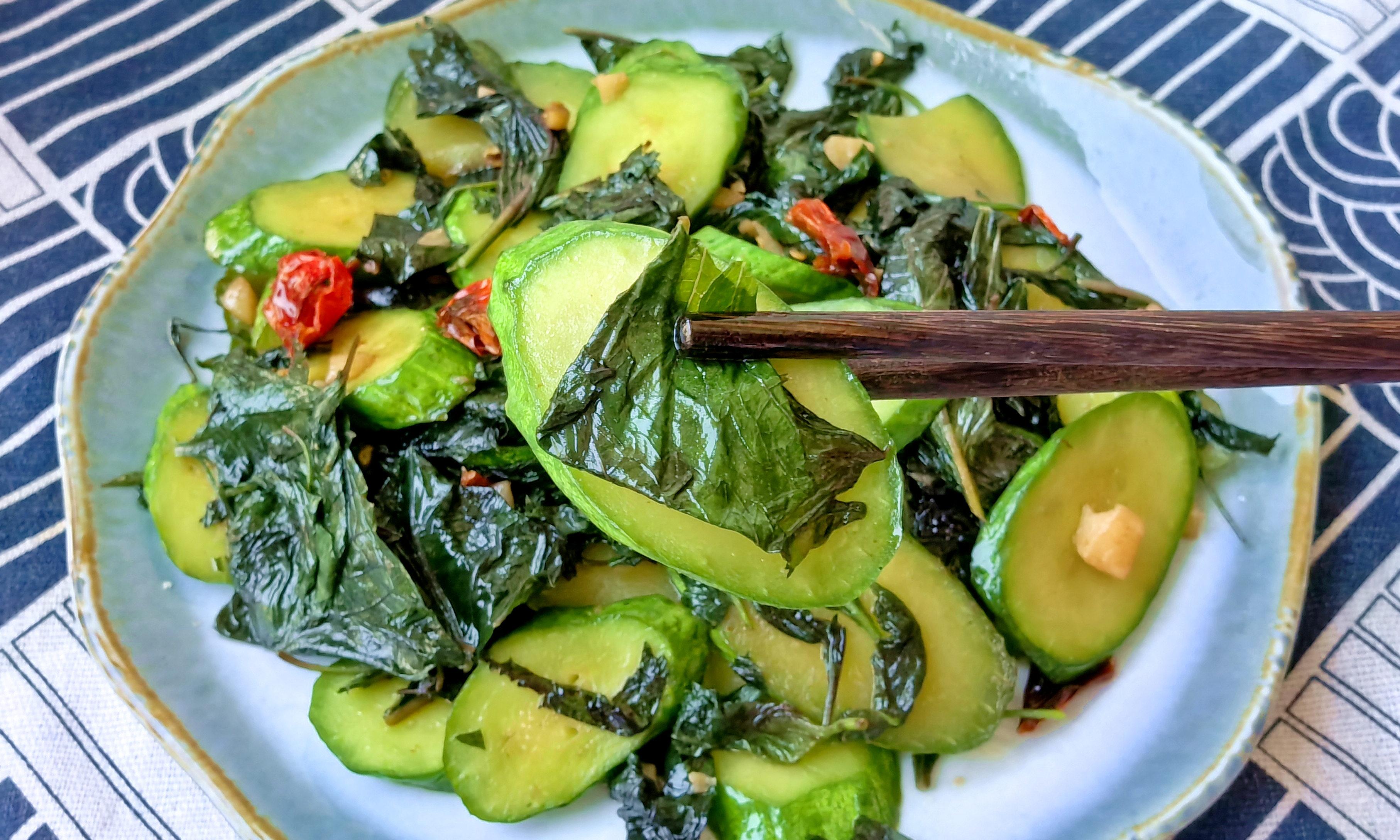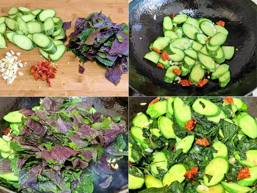 準備材料:嫩黃瓜2根、紫蘇葉1把、蒜末3瓣、小米辣2根、鹽1小勺、蠔油半勺、白糖半勺