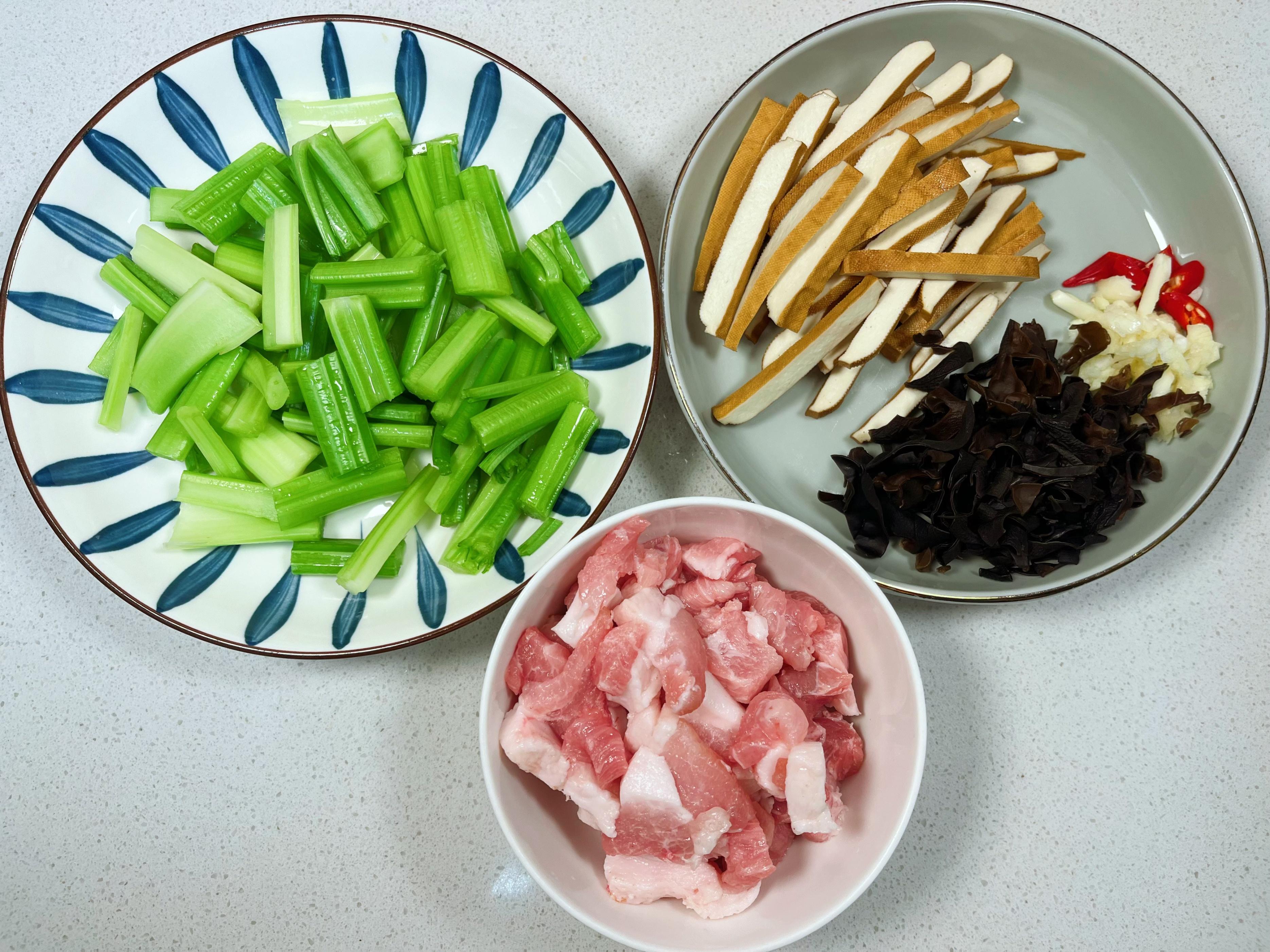 準備的食材有:豬裏脊150克、豆乾3塊、芹菜1把(約200克)、木耳、薑末1小勺、蒜2瓣。調料只要生抽2勺、老抽半勺、料酒1勺、澱粉1茶匙、糖小半勺。