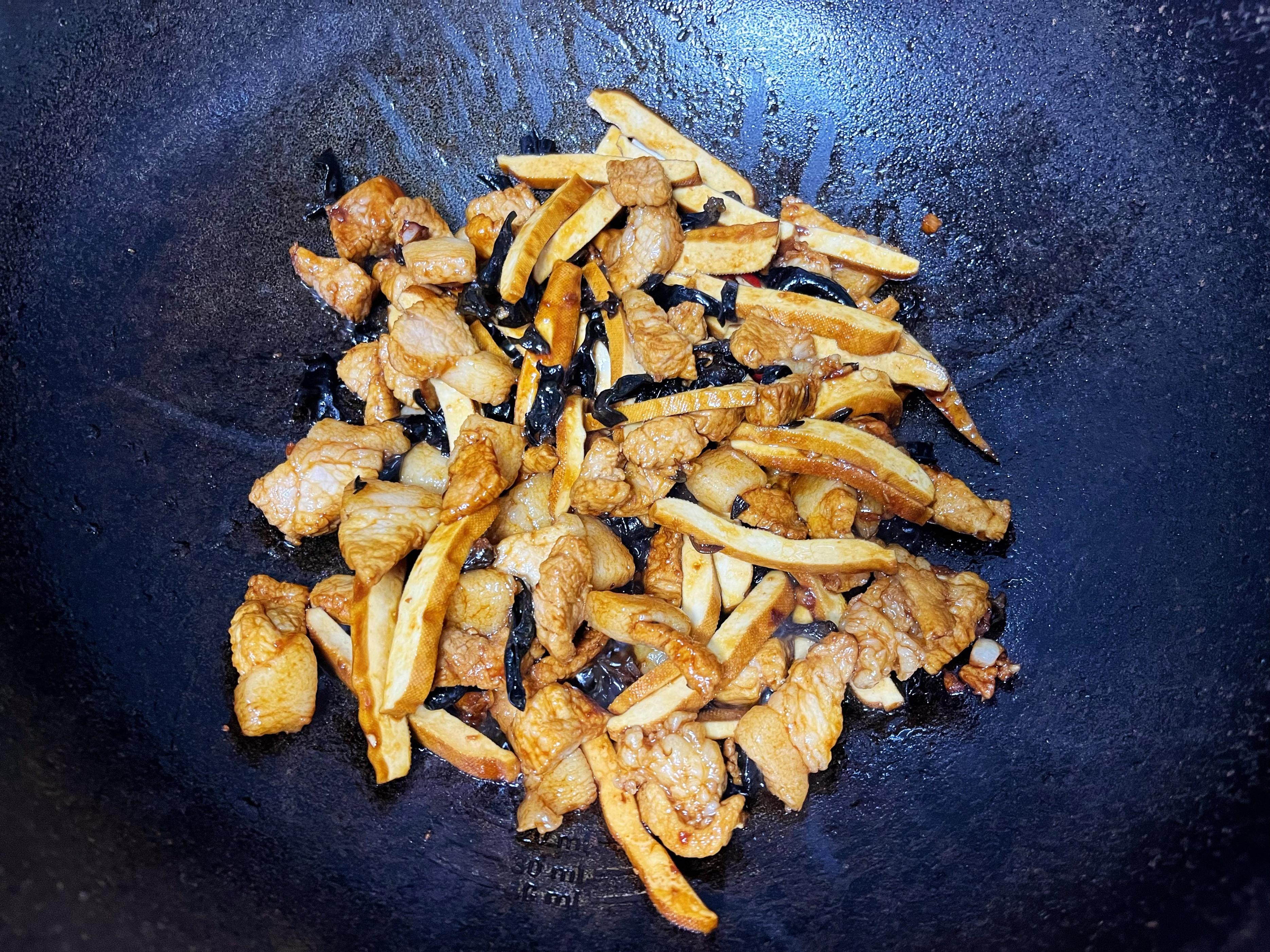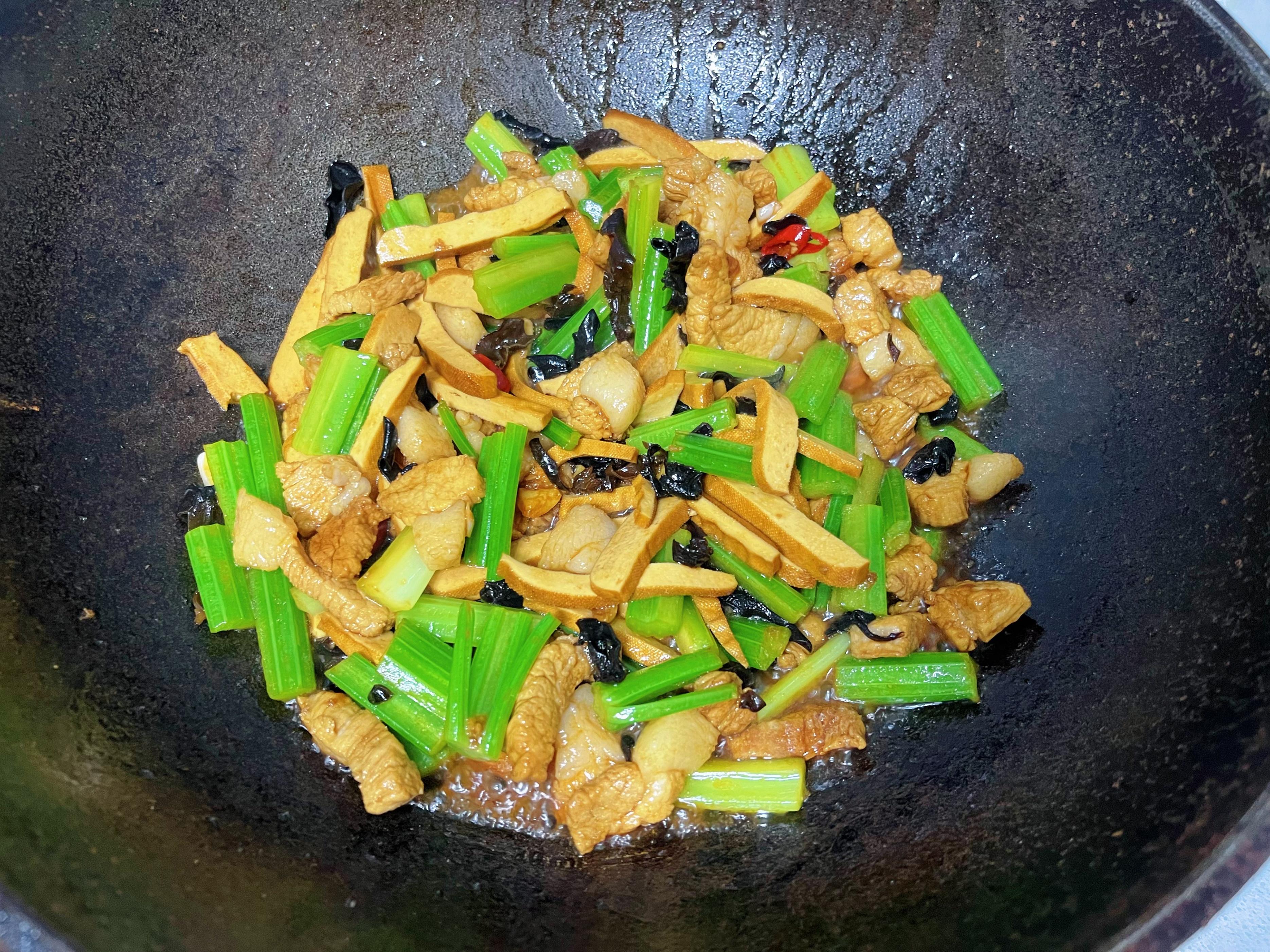 5、倒入芹菜、木耳段快炒30秒,把肉片回鍋,淋入剩下的調料