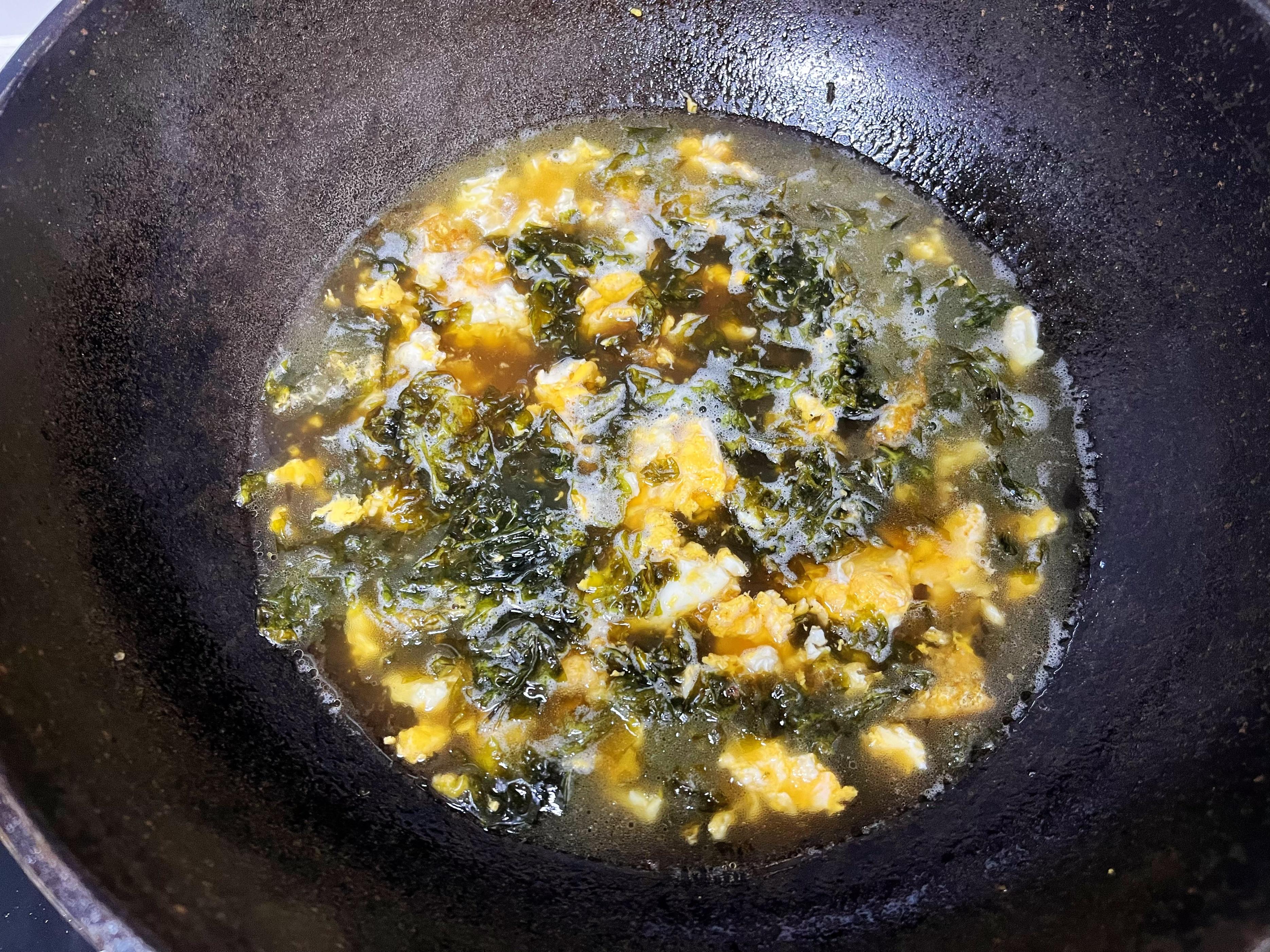 3、紫菜撕碎入鍋,撒蝦皮,煮1分鐘讓鮮味釋放