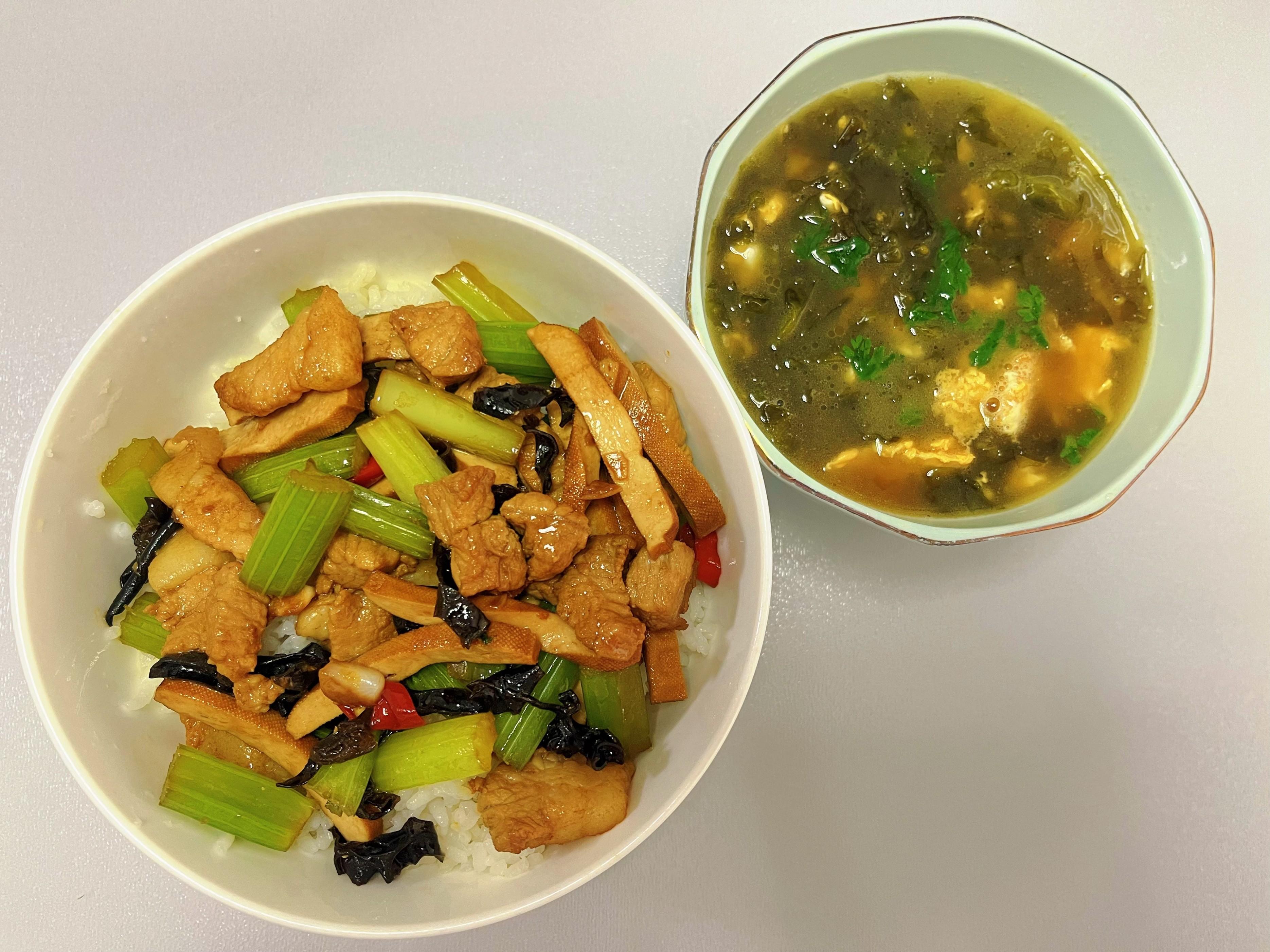 這兩個菜搭配起來堪稱黃金組合:炒菜裏的豆乾補鈣,芹菜富含膳食纖維;湯裏的紫菜含碘,雞蛋提供優質蛋白。最重要的是份量可控,我試過用300克肉+4塊豆乾+250克芹菜,剛好夠三口之家喫完。