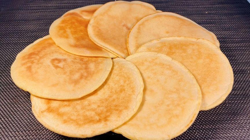 2、醒發好後,用筷子攪拌排氣,平底鍋預熱,不用刷油,舀入一勺麪糊,自然滴落成圓形,蓋上蓋子,中火烙至麪糊定型,最後烙至兩面金黃,按壓邊緣能快速回彈,就可以出鍋啦。