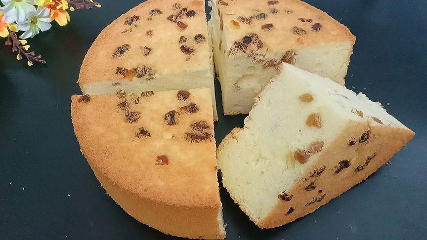 1、兩個雞蛋,一盒酸奶,一勺糖,兩勺澱粉,充分攪拌均勻,模具刷油,倒入麪糊,擺上葡萄乾,蓋上保鮮膜,扎小孔,上汽蒸30分鐘。