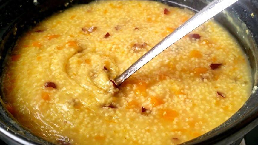 2、小米和水的比例大概是1 : 15,等水開之後再下入小米。水開之後再下入南瓜,紅棗,保持大火燒開之後,再調小火,蓋上蓋子煮20分鐘左右,用勺子順着一個方向不停的攪拌,這個時候關火,蓋上蓋子,燜十分鐘左右,小米粥就可以開喫了。