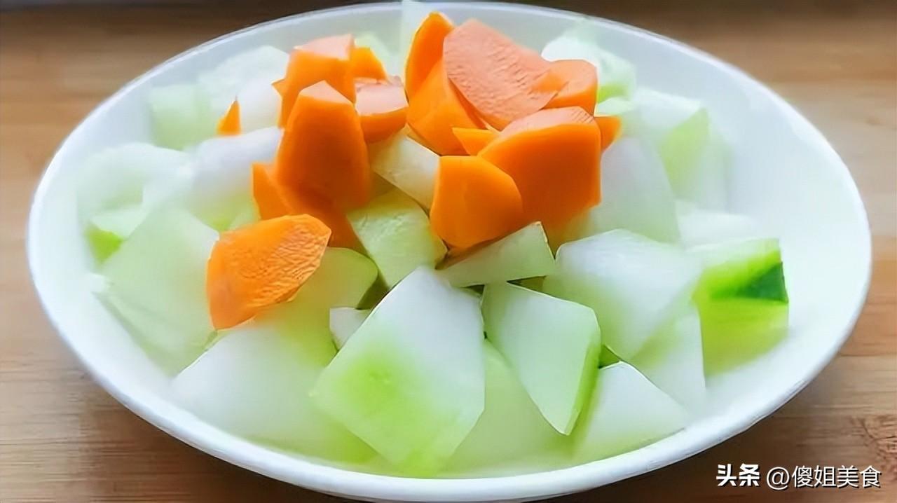 【具體做法】1、冬瓜清洗乾淨,對半切開後挖掉瓤,削皮切成麻將塊厚度,如果比較嫩的小冬瓜可以不用削皮哦。胡蘿蔔削皮同樣切成小塊。