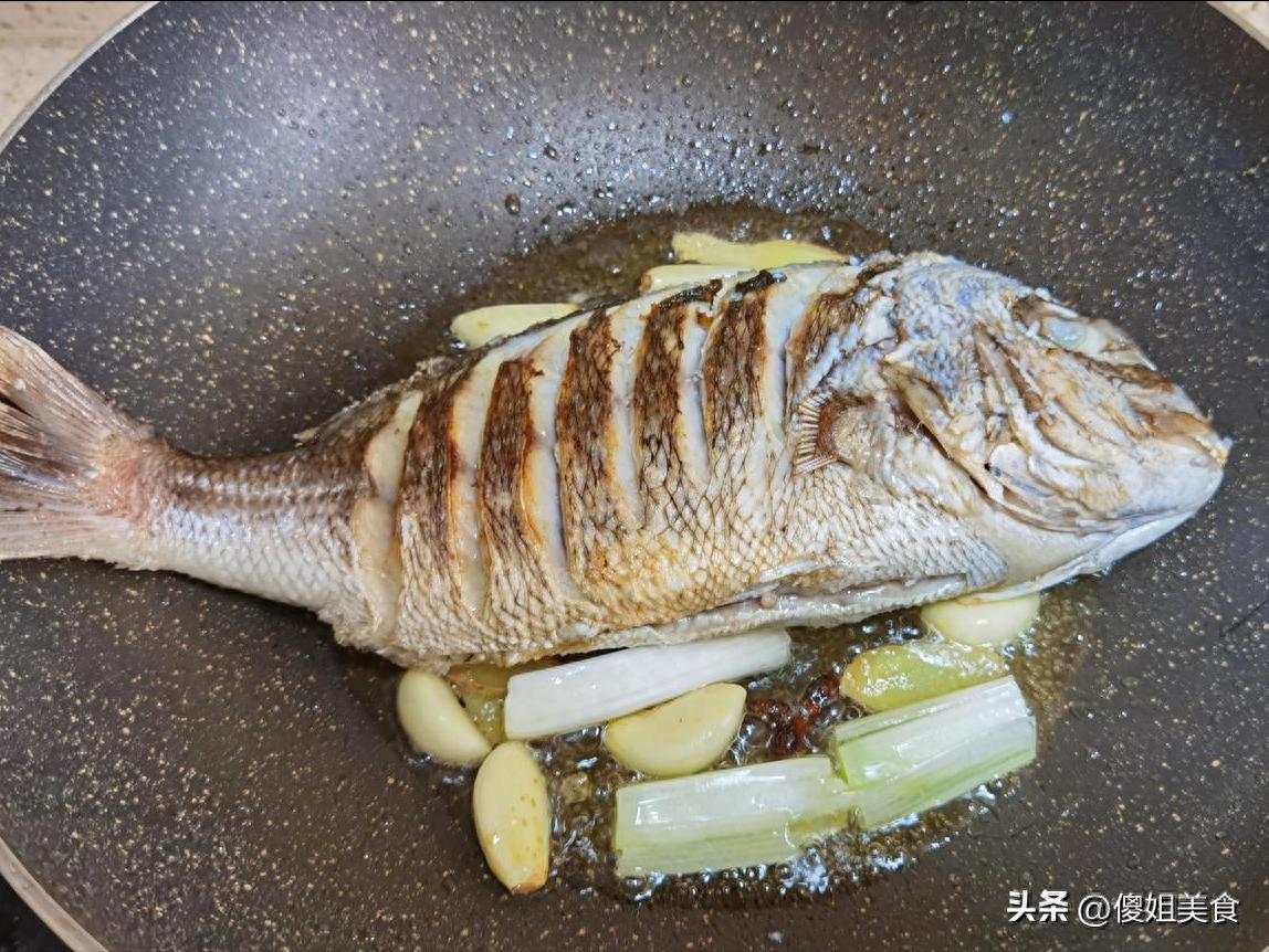 別手賤總去扒拉!中小火煎3分鐘後,抓着鍋柄輕輕晃動,要是魚能自由滑動再翻面。我閨蜜上次心急用鍋鏟硬撬,結果魚尾巴留在鍋裏,身子飛到了抽油煙機上...