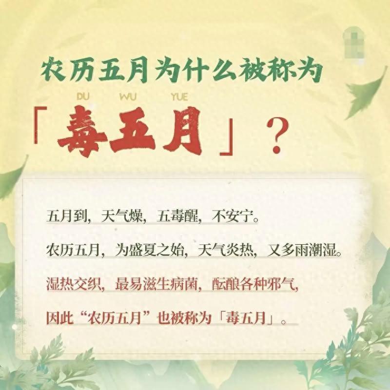 2文化因素。5月來來到,一年一度的端午佳節也來了,端午節的傳統習俗,如掛艾草、佩香囊、飲雄黃酒,本質上都是古人應對“毒月”的生存策略。