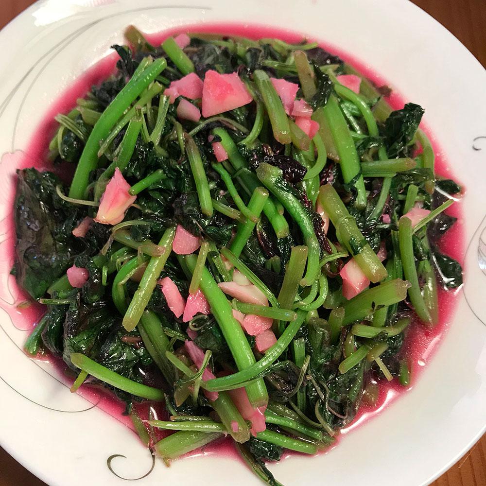 推薦喫法,蒜蓉紅莧菜。搭配大蒜一起炒,既中和了莧菜的寒性,也爲莧菜增添了幾分香味。味道香,顏色好看,裏面的湯汁泡飯,味道一絕。