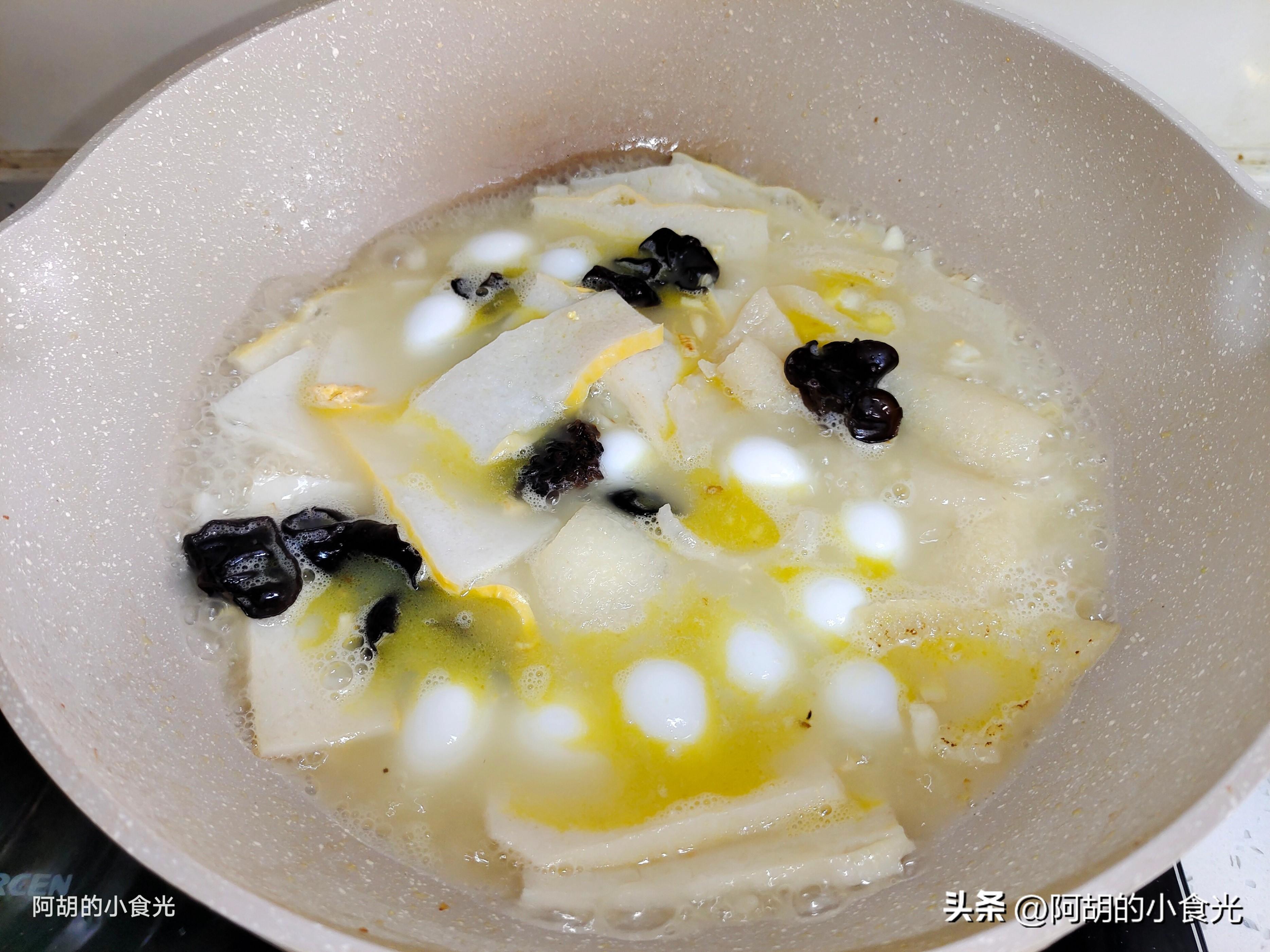 第四步:往鍋中衝入高湯,沒有高湯的就直接加入開水即可,而後將鵪鶉蛋、木耳也一塊倒入鍋中,大火將其煮開,加入一些食鹽、少許胡椒粉、鮮雞汁調味,沒有“鮮雞汁”這個調味料的可以用雞精或者松茸鮮代替,保持中小火繼續煮個5分鐘左右。