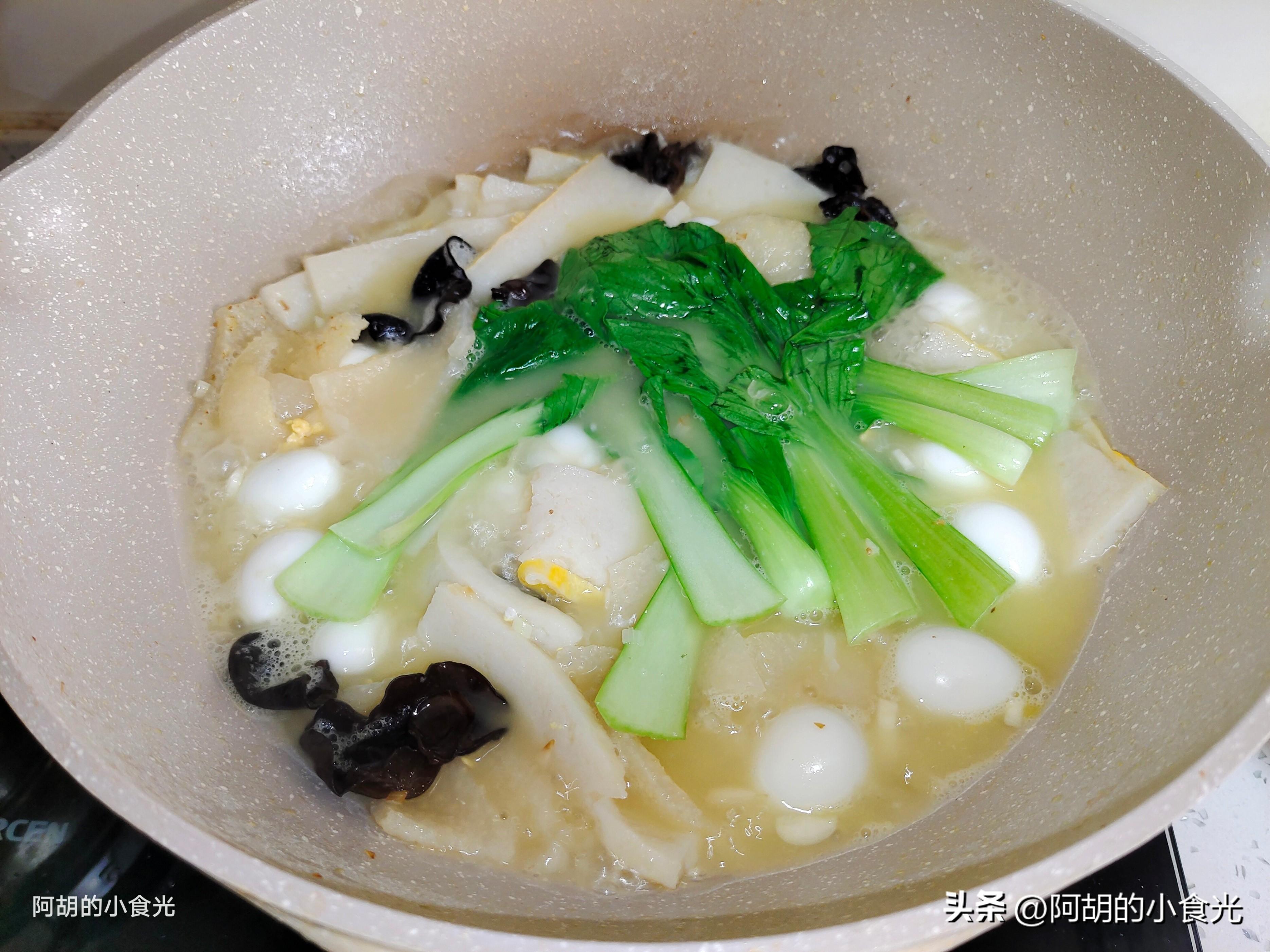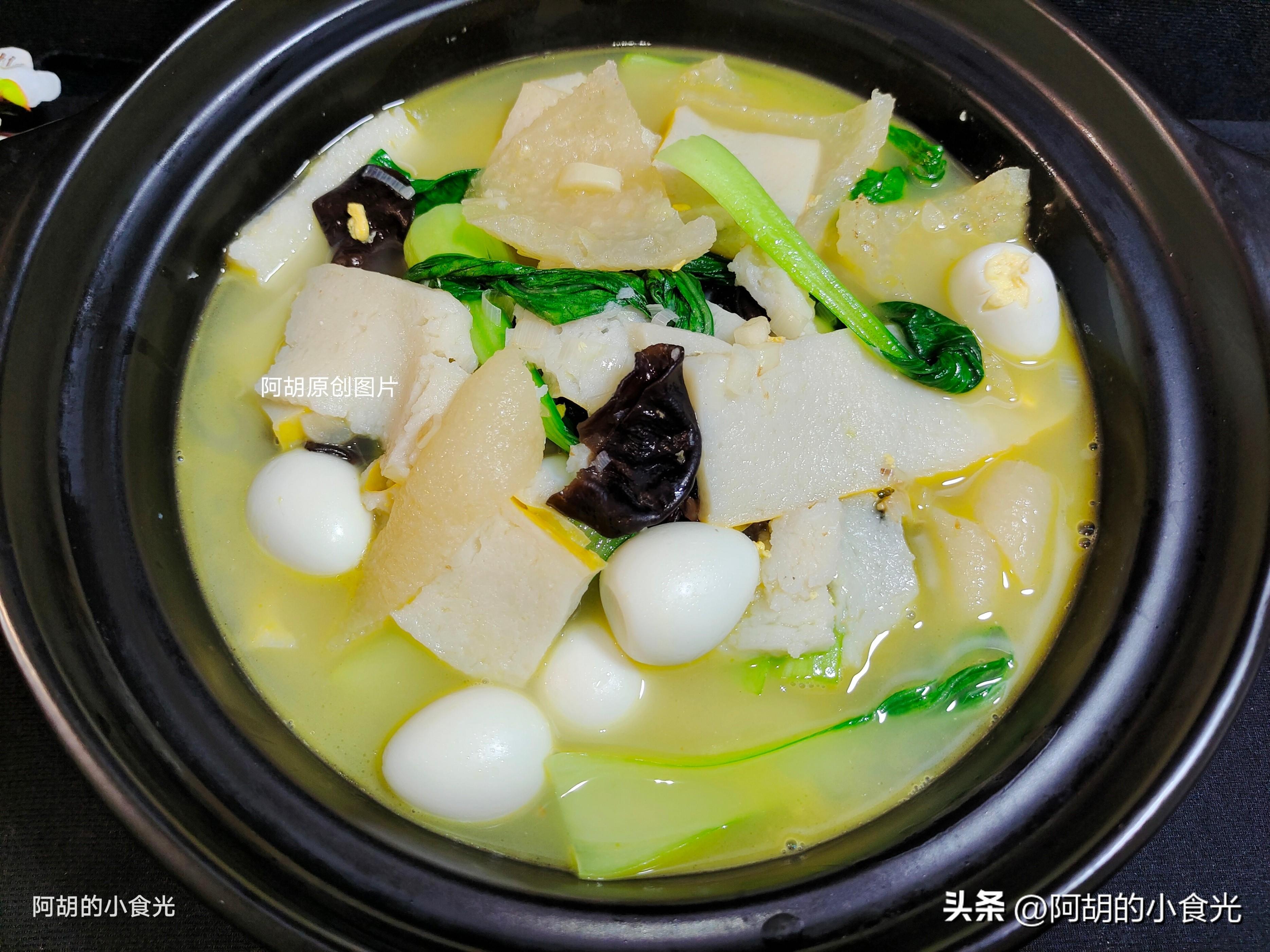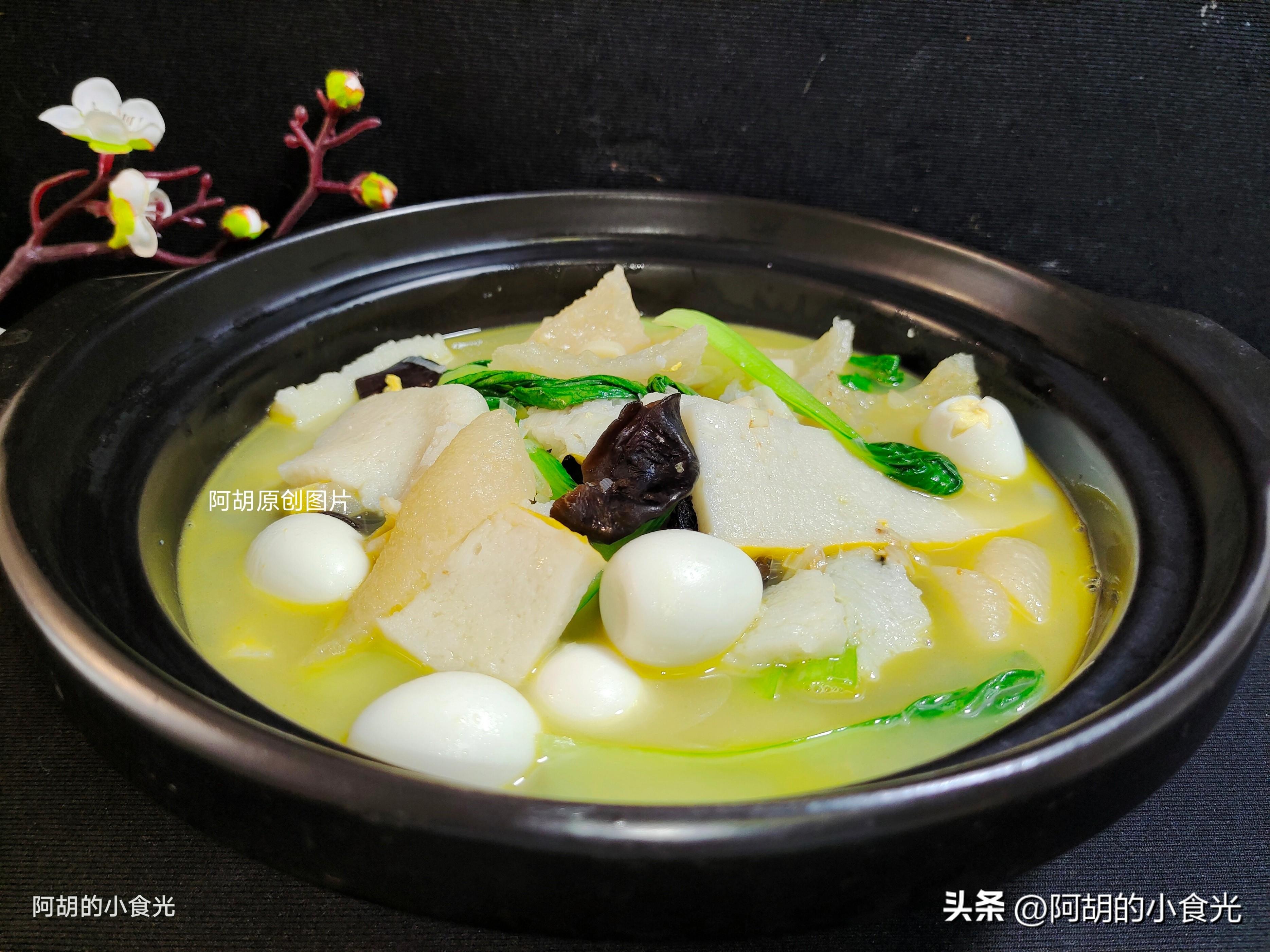 今天這道燉菜的食材主要由魚糕+鵪鶉蛋+皮肚+木耳+青菜組合而成,其中的“魚糕”口味鮮嫩,也是這道菜鮮味的主要來源之一,再搭配鵪鶉蛋、皮肚、木耳和青菜,味道清爽鮮美的同時又不失好營養,值得各位試一試。