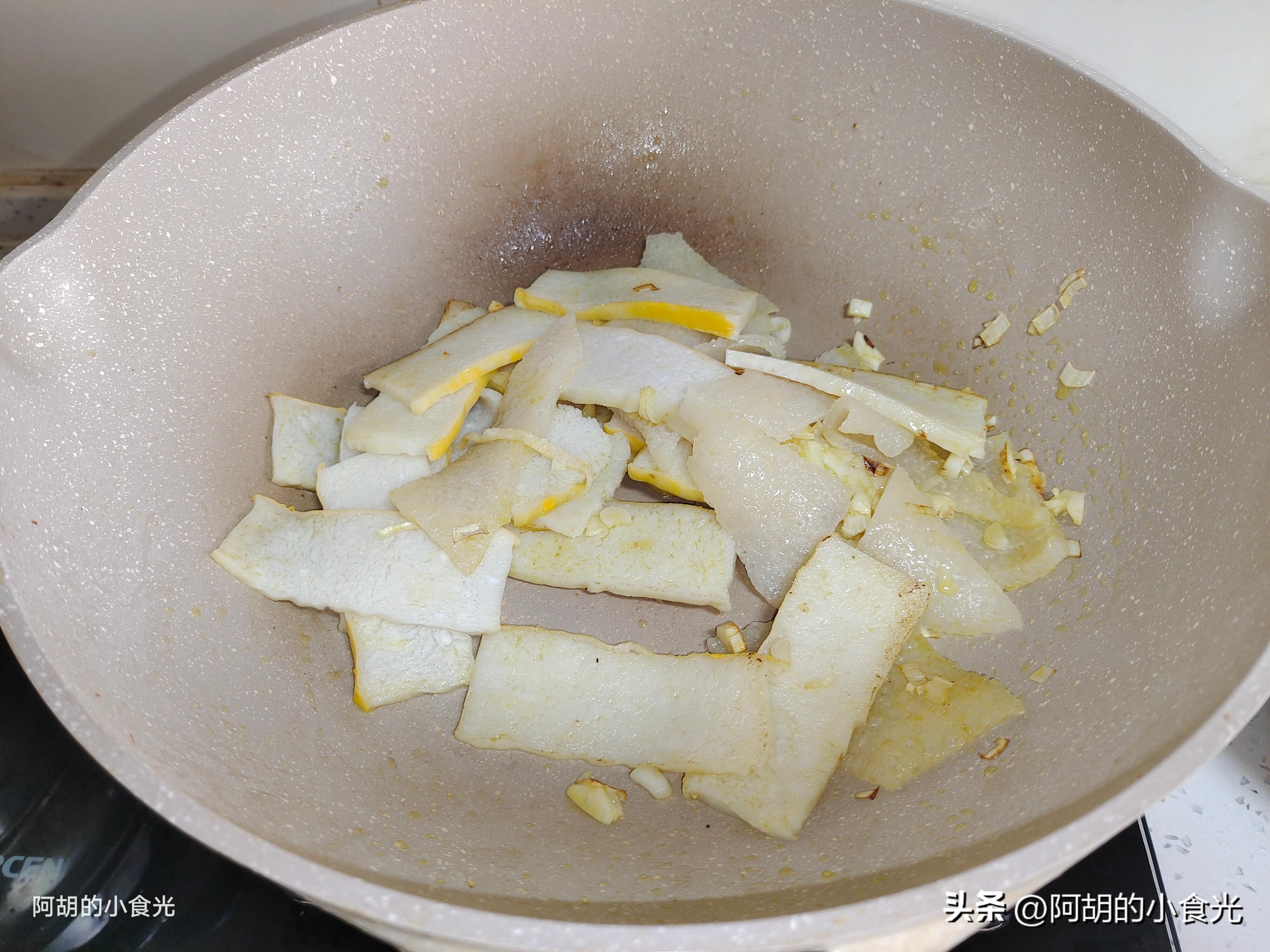 第三步:所有的食材準備完畢後就可以烹飪了。鍋燒熱後淋入一些菜籽油小火燒熱,把蔥花下鍋炒出香味,接着把魚糕和皮肚先下鍋炒一炒,炒出食材的香味。