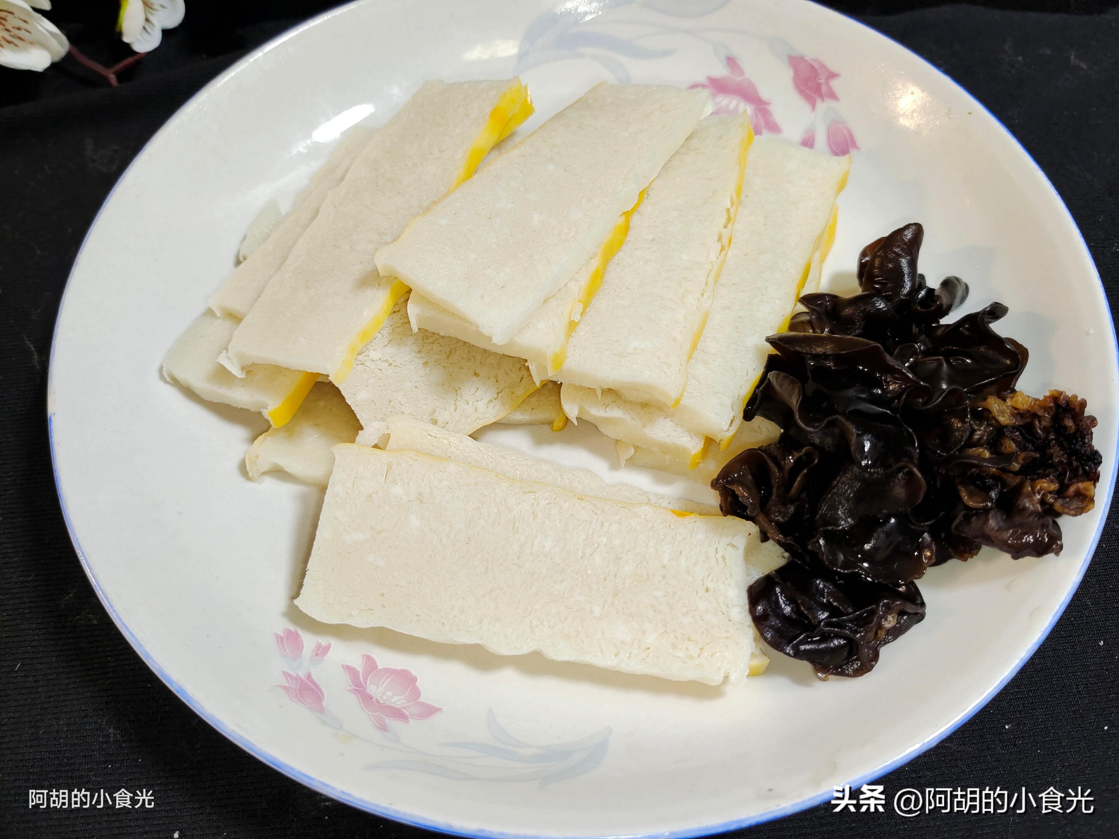 第一步:今天所用的食材比較豐富多樣,其中最主要的一個就是“魚糕”,其主要是由魚肉糜、豬肉、雞蛋和澱粉混合經過調味後蒸制的來,和前段時間分享的“肉糕”很像,想喫的超市和網購都可以尋得到。拆開包裝後將其切片後備用,順便再泡發少許的木耳待用。