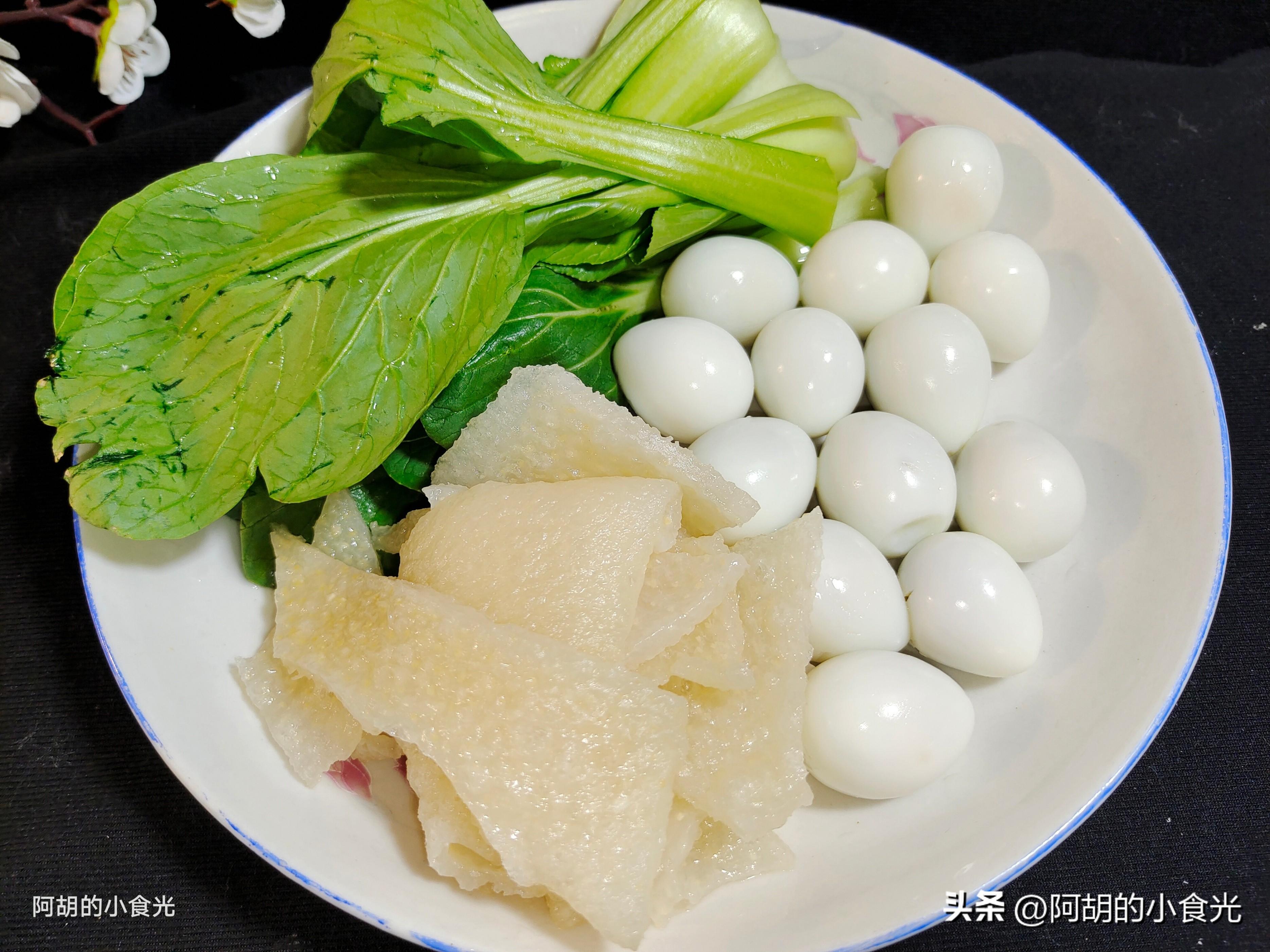 第二步:不只是魚糕和木耳,還需要準備十幾個鵪鶉蛋煮熟後去殼,兩棵小青菜洗乾淨備用,還有一塊豬皮肚切開成小片備用,一些蔥花作爲小料待用。其中的豬皮肚使用前最好焯水燙一下再用。
