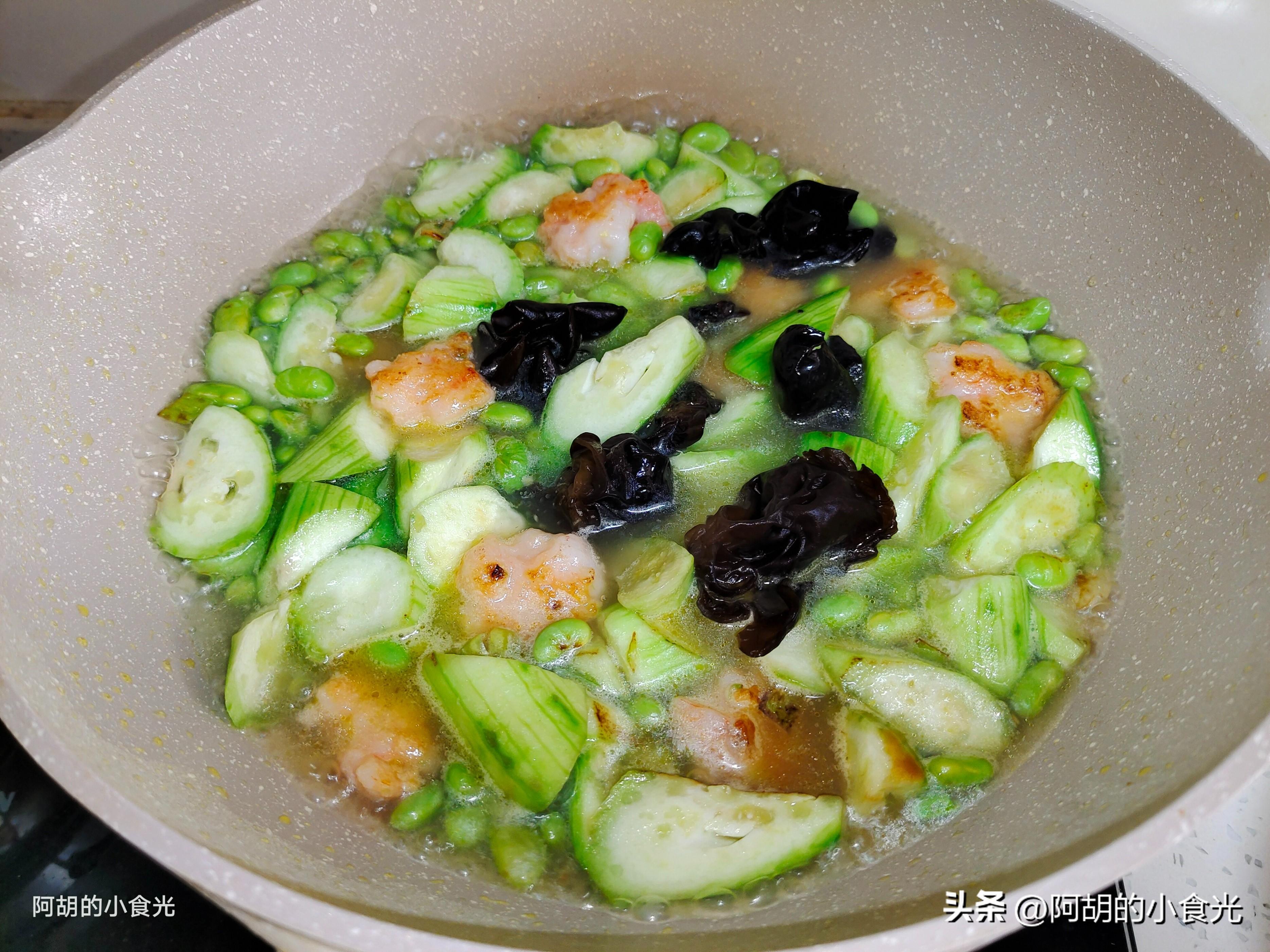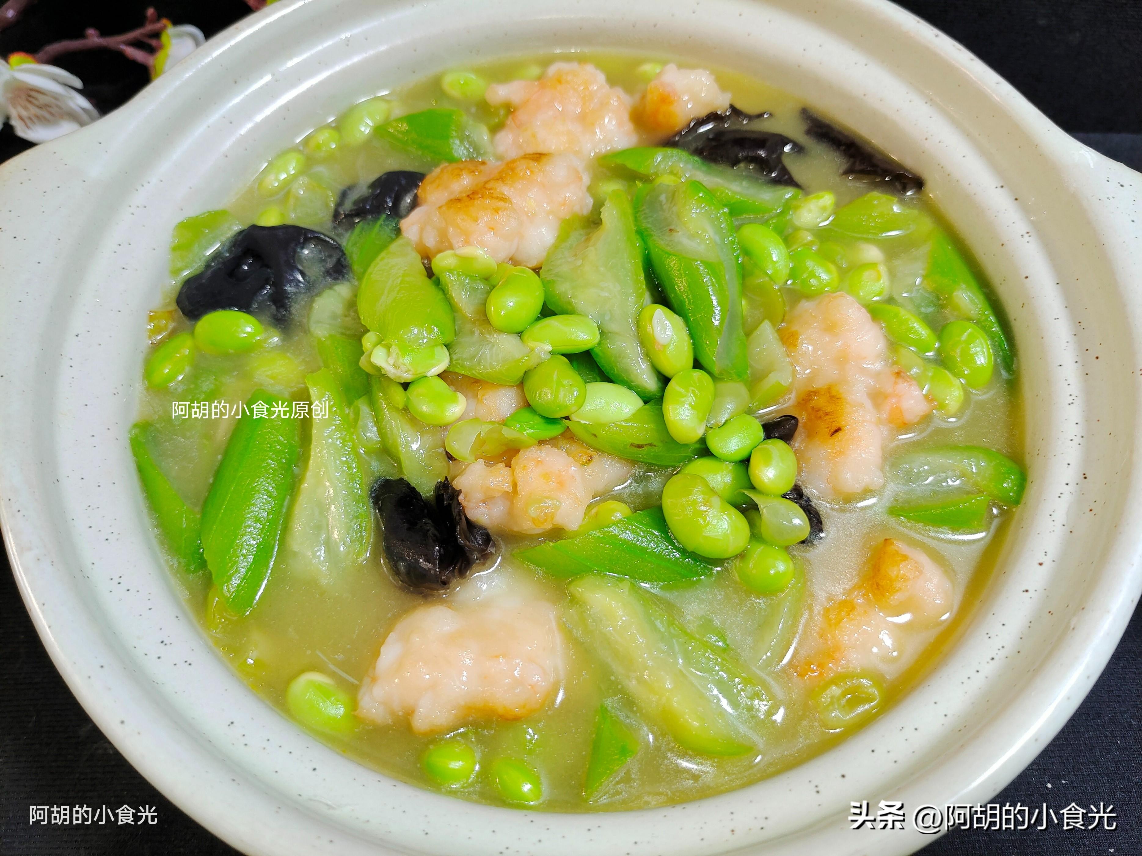 今天這道菜餚的主要食材由絲瓜+毛豆+蝦滑+木耳組合而成,絲瓜和毛豆都是夏季的應季時蔬,天熱常喫好處多多,搭配蝦滑和木耳簡單地燉一鍋,有葷有素,鮮香又開胃,妥妥的人間美味。