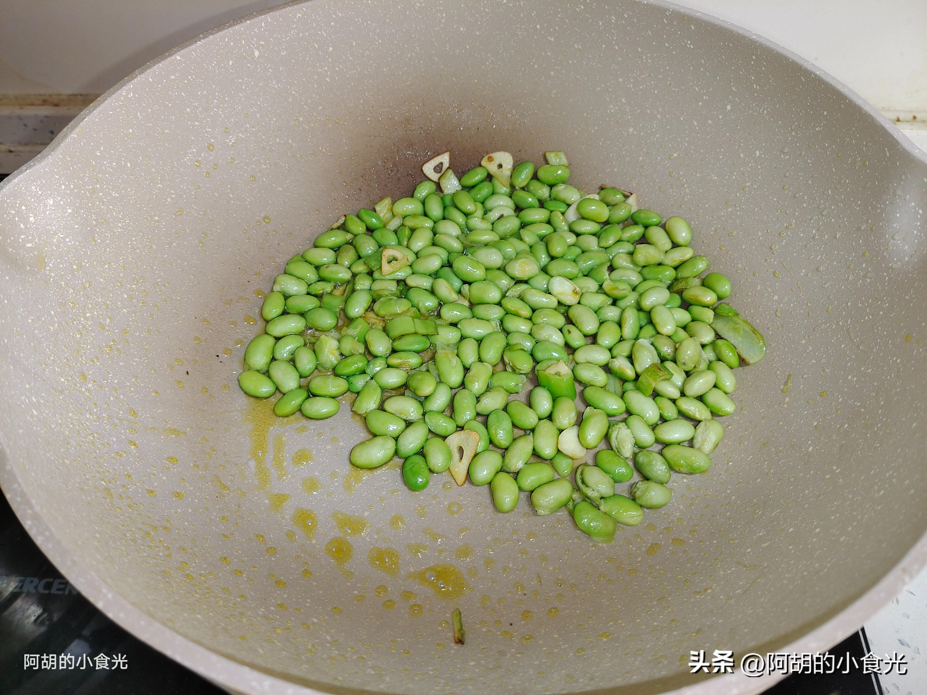 第四步:所有食材準備完畢後就可以烹飪了。鍋燒熱後淋入一些菜籽油小火燒熱,將小料蔥蒜下鍋炒出香味,接着再把鮮毛豆仁倒入鍋中,轉爲大火翻炒出香味。