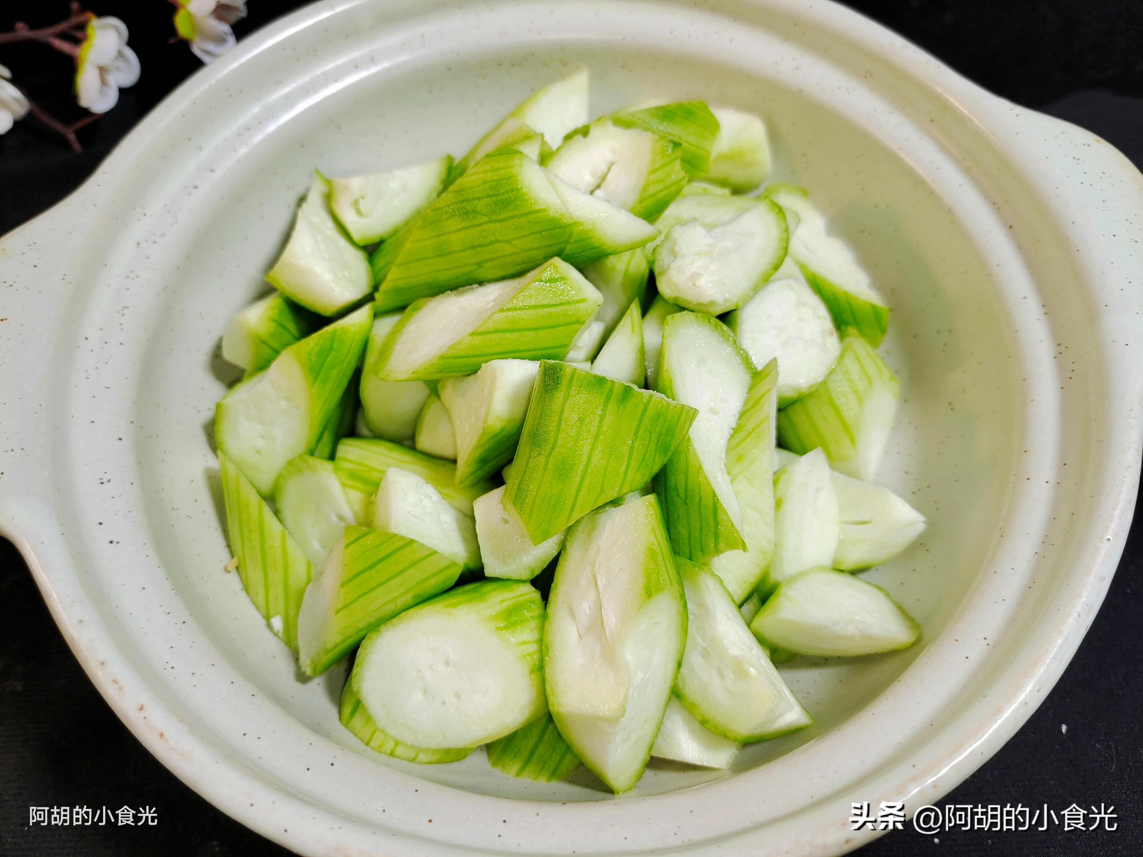 第一步:先來準備兩根絲瓜,削去外皮後將其切開成滾刀塊。爲了防止絲瓜接觸空氣後氧化變色,這裏建議將絲瓜浸入涼水中,並滴入幾滴白醋攪拌均勻,如此可以防止其變色發黑。