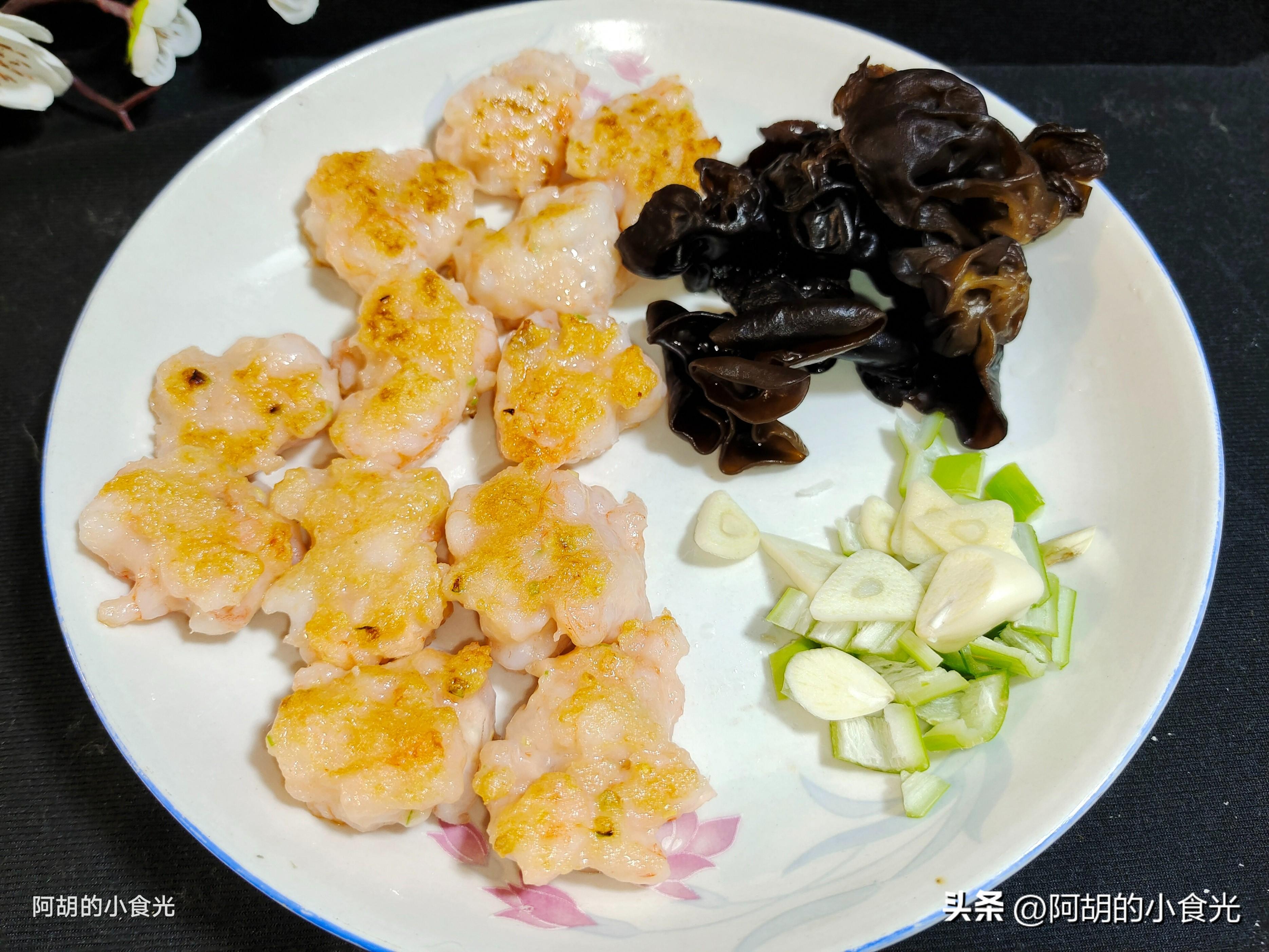 第三步:鍋燒熱,淋入少許的食用油,將調製好的蝦滑一塊一塊地下鍋,煎至兩面顏色金黃就可以出鍋待用了。順便再準備少許泡發的木耳,一些蔥蒜作爲小料,還有小半碗的鮮毛豆仁備用。